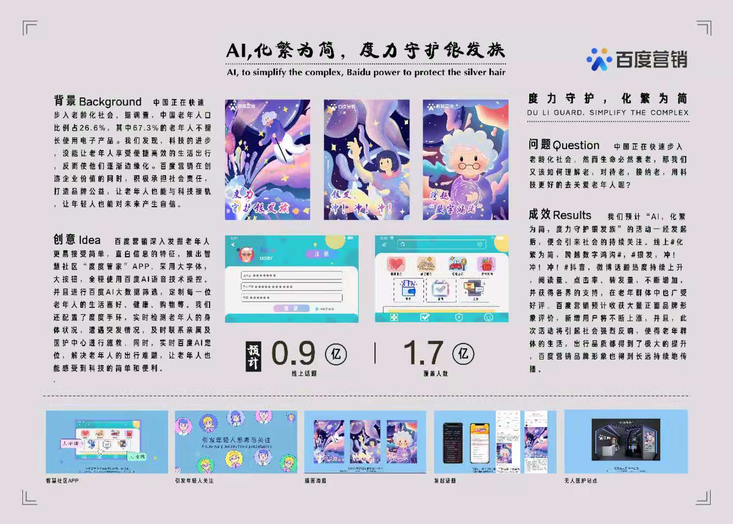 AI,化繁为简,度力守护银发族 0 119 0 2021ONE SHOW中华青年创意奖 分享 中国正在快速步入老龄化社会,据调查,中国老年人口比例占26.6%,其中67.3%的老年人不擅长使用电子产品。我们发现,科技的进步,没能让老年人享受便捷高效的生活出行,反而使他们逐渐边缘化。针对老年人更易接受简单直白的特点,我们联合百度营销发起一次“AI,化繁为简,度力守护银发族”的营销活动。 赞一下 唐朝胖美人 ‹ › 发布
