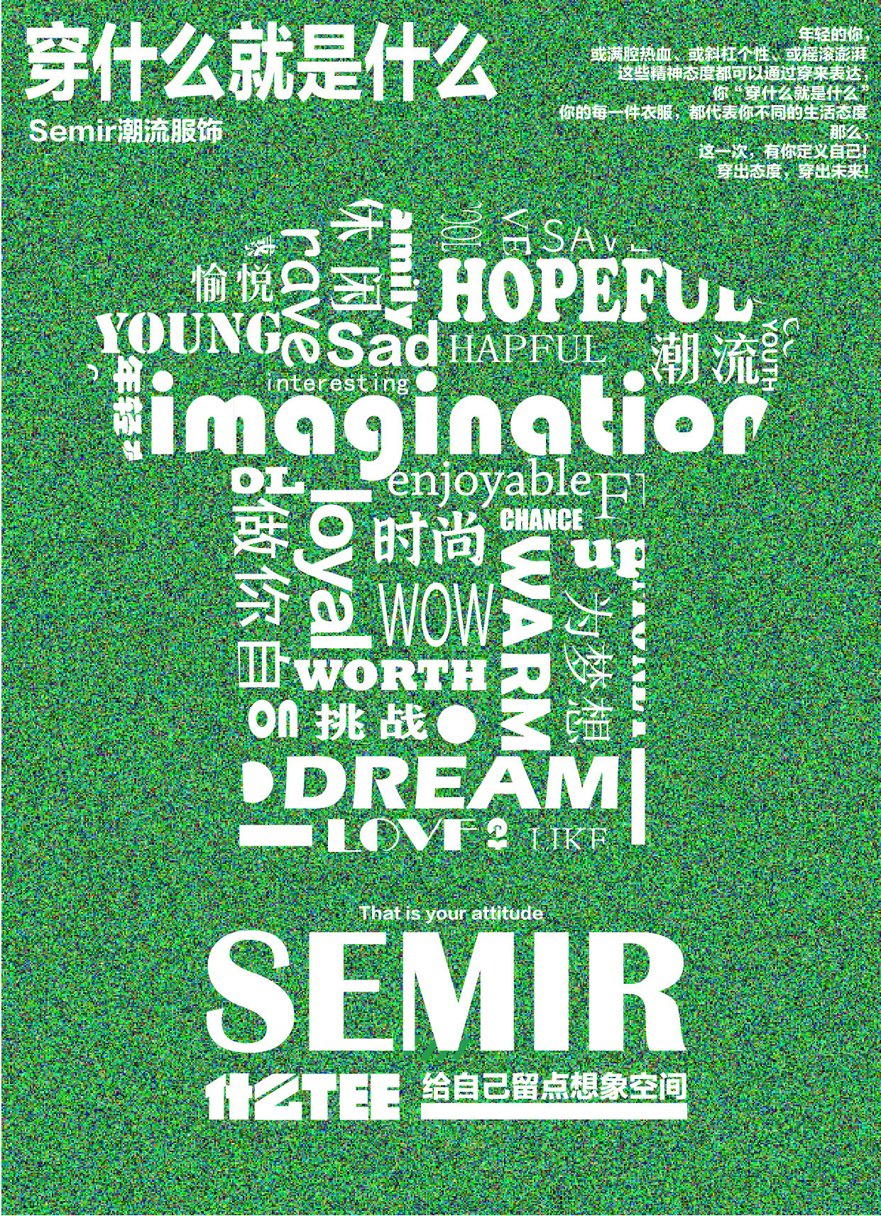 给自己留点想象空间 0 100 0 森马什么TEE 分享 将代表情绪的单词或文字与衣服相结合,鼓励年轻人们自己想象自己的心情,穿上这件衣服,就能是什么心情。让年轻人们自己决定自己的心情,旨在给人们留一些想象空间。 海报色调采用绿白色,符合森马品牌的常用颜色。背景采用沙粒,营造一种想象空间。 赞一下 鸢尾 济南市 关注 查看更多信息 ‹ › 发布