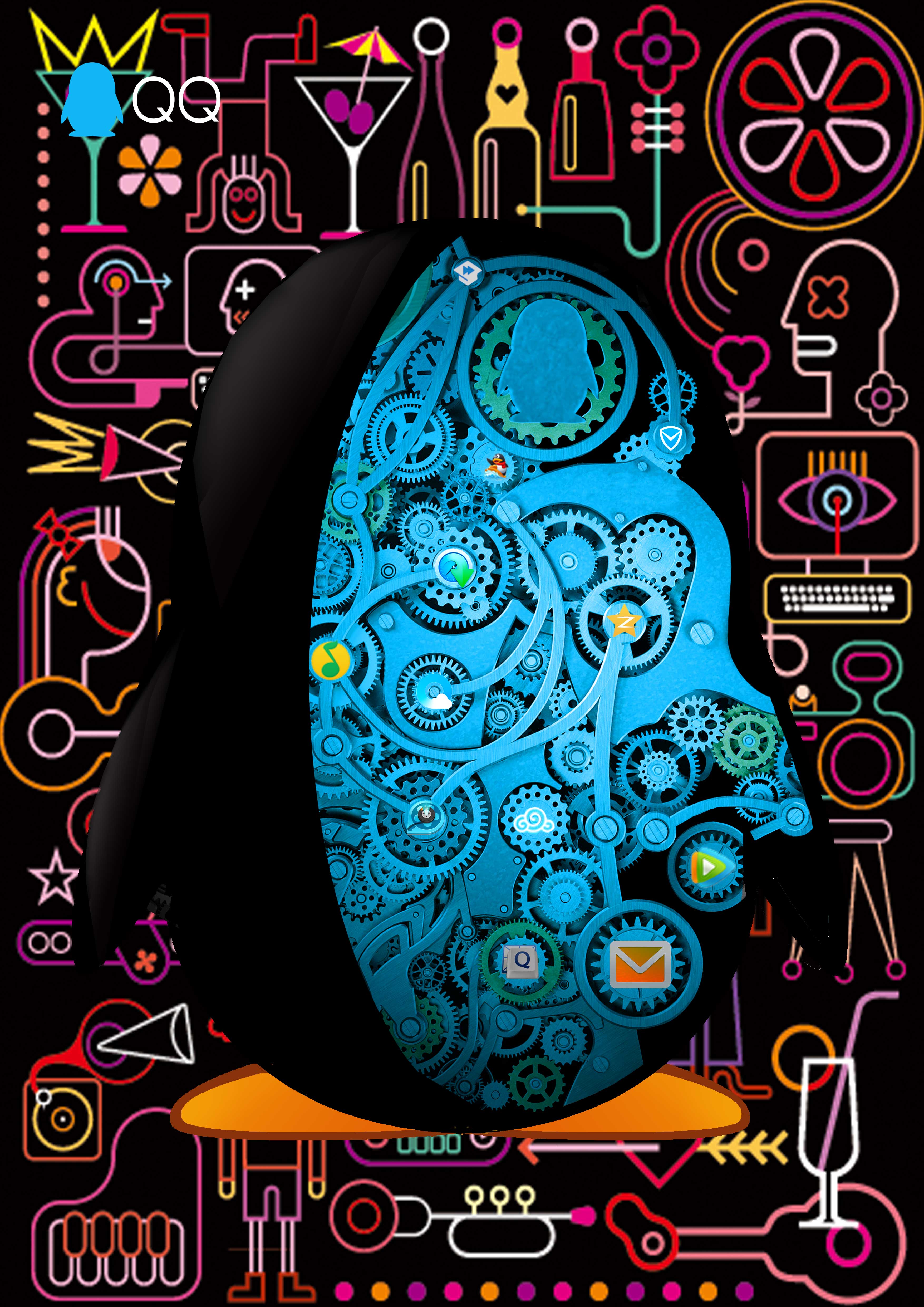 BODY——是通过将QQ企鹅这一形象进行解构,将QQ变为以齿轮带动的生命体,将齿轮的重要部分置入QQ旗下几个重要的应用如:邮箱、视频、游戏、音乐、输入法、空间、旋风,几个齿轮带动下的QQ组成一个有机整体将QQ企鹅这一形象变得更为生动,而这个有机的QQ企鹅也将各个重要的应用连接起来,背景的设置采取了几个重要的生活工具和人类表达着QQ渗入到用户生活的方方面面,为用户的生活做着更好的连接体现核心使命“QQ——让连接更有趣。”