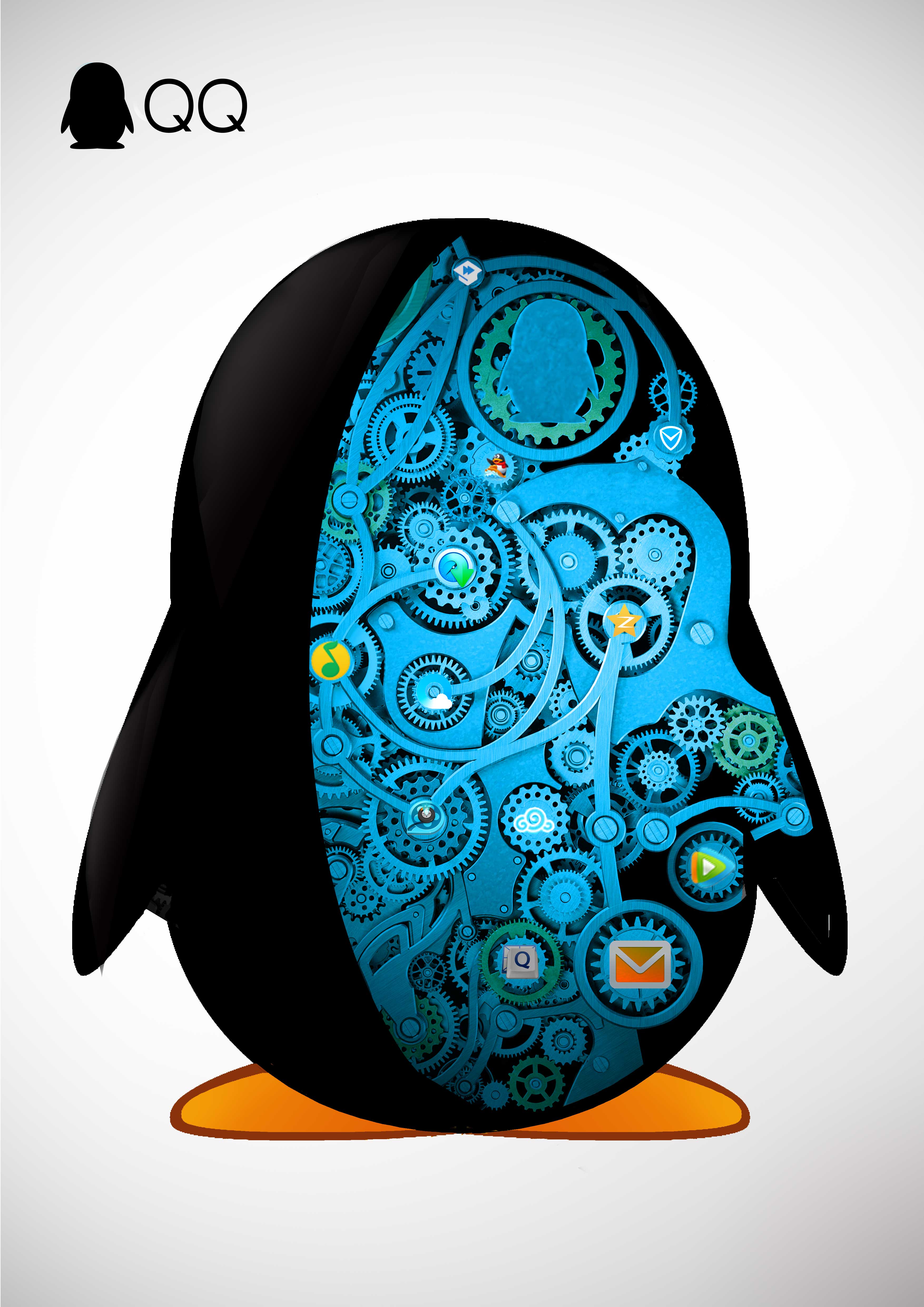 BODY——是通过将QQ企鹅这一形象进行解构,将QQ变为以齿轮带动的生命体,将齿轮的重要部分置入QQ旗下几个重要的应用如:邮箱、视频、游戏、音乐、输入法、空间、旋风,几个齿轮带动下的QQ组成一个有机整体将QQ企鹅这一形象变得更为生动,而这个有机的QQ企鹅也将各个重要的应用连接起来,背景的设置采取具有太空属性的太空白,是画面具有立体感同时也将QQ带入一个新的环境——宇宙,将QQ的服务范围扩大到更为宽广的层面,同时QQ的服务内核也是不会变化的,为用户的生活做着更好的连接体现核心使命“QQ——让连接更有趣。”