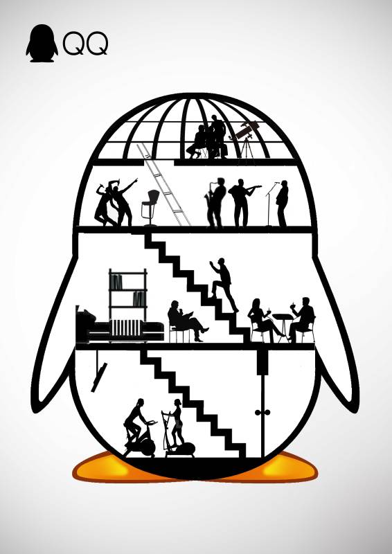 缩影:该幅作品是以剪影的形式把人们的日常生活形态呈现出来,形象的把QQ企鹅看作一栋大楼,一个QQ的世界,通过大楼中的楼层将不同工作和不同爱好以及不同形态的人巧妙放置在一个有机整体中,通过这个设计——楼梯,可以连接到不同的领域,在QQ建筑的“大楼”中,经过不同的思想碰撞,融合,不同领域之间的交流,把QQ当作了一个桥梁,连接着彼此,一起合作,游玩,同时,结合了中国特有特色剪纸的元素,使得整体效果简单大气,干净,更符合扁平的设计风格,在QQ这个世界里可以没有障碍的进行沟通,获得到不同思维产生的新奇乐趣,从而体现了QQ的核心使命-"QQ让连接更有趣”。