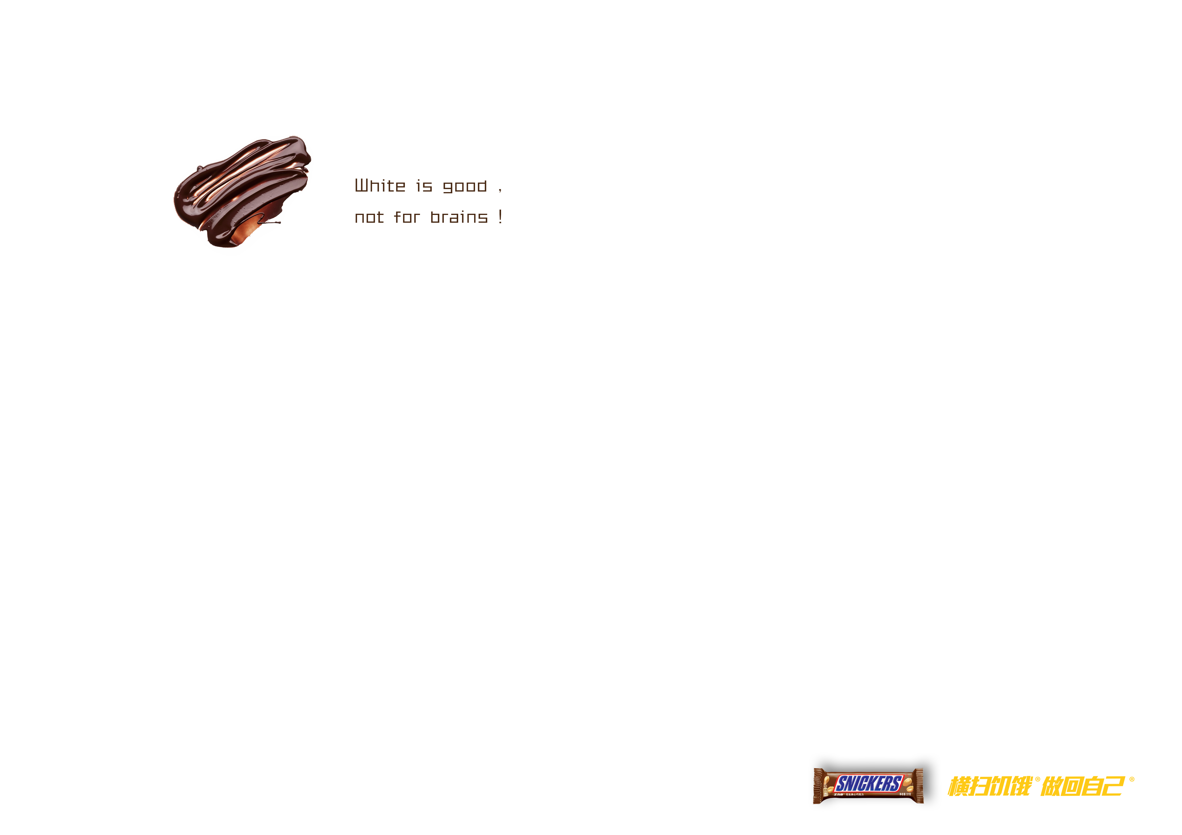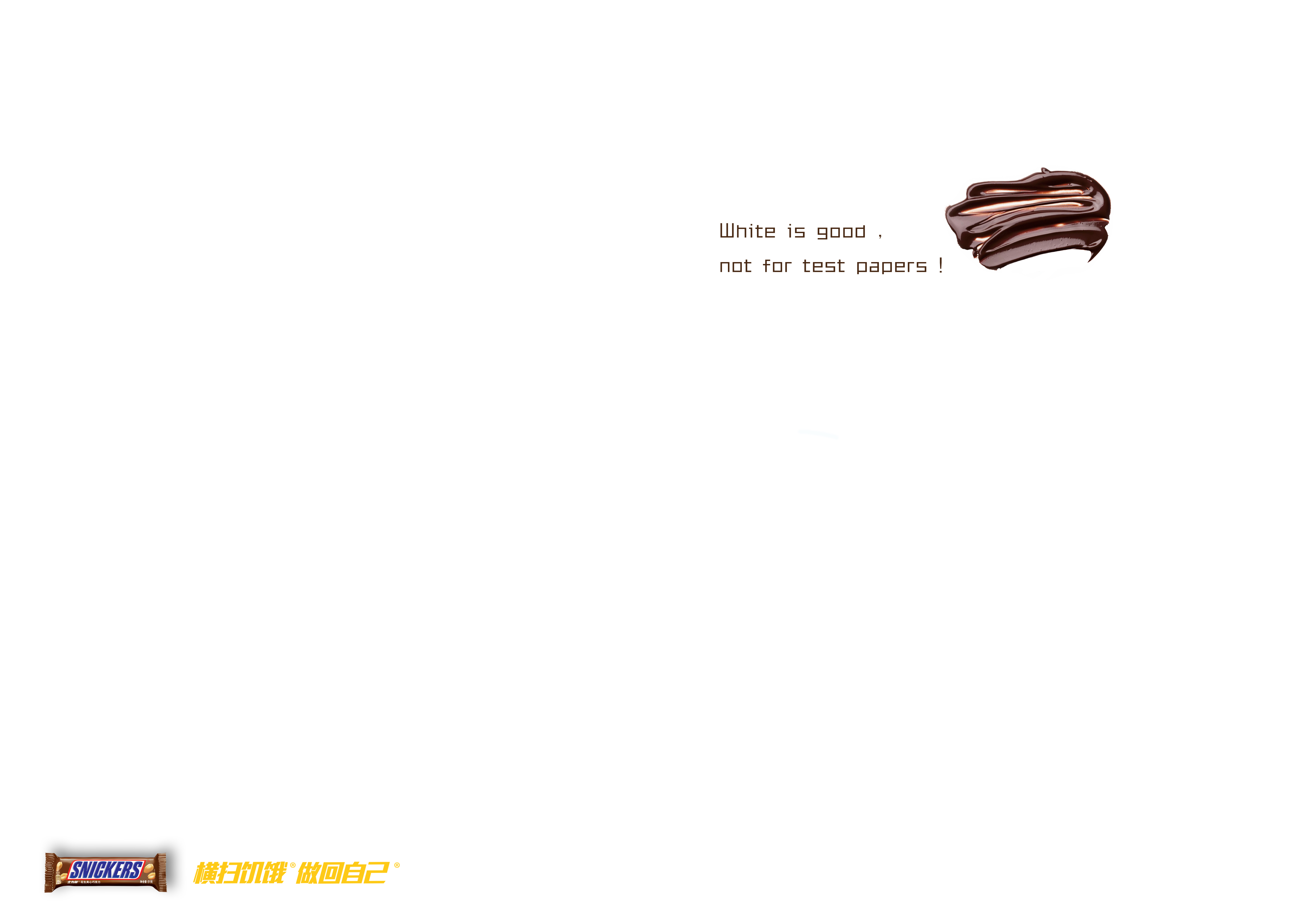 一片空白 725 2603 0 设计 分享 在一片空白中加入士力架的巧克力糖的浆,做成污渍的感觉。用"White is good,not for brains"表示白色的东西有时候被污染了是不好的,但有时候太白的东西就需要加点料。表明士力架可以帮助考试,不至于脑子一片空白。 在一片空白中加入士力架的巧克力糖的浆,做成污渍的感觉。用"White is good,not for test papers"表示白色的东西有时候被污染了是不好的,但有时候太白的东西就需要加点料。表明士力架可以帮助考试,不至于交白卷。 赞一下 lily 上海市 关注 查看更多信息 ‹ › 发布
