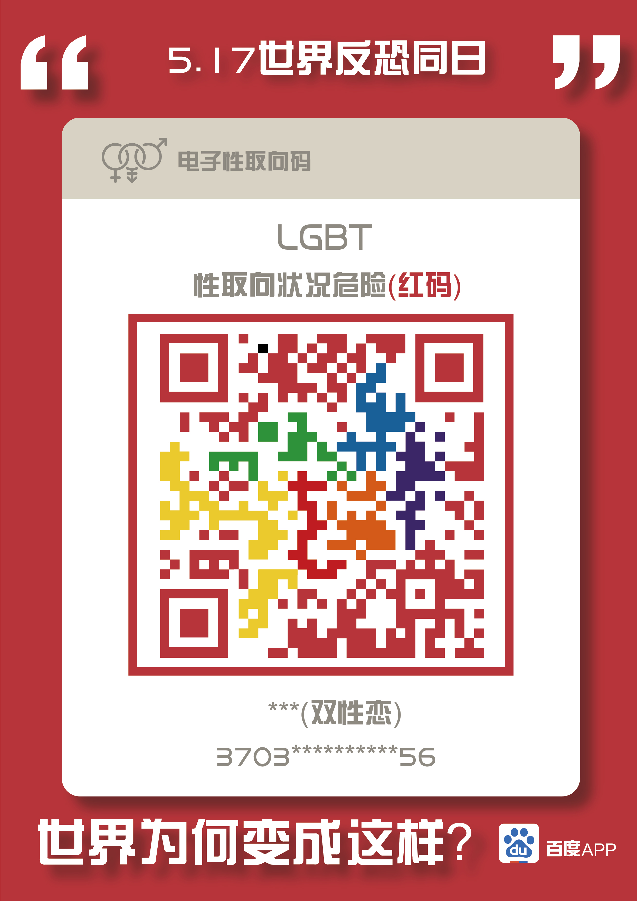 在此系列创意招贴海报中,整体形象使用了微信健康吗,健康状态改编成了性取向状况,双性恋设置成了“危险”的红码形象,中间的二维码可以用手机扫取,扫去可以看到一张文字海报,海报内容为“爱就是爱,无关性别”