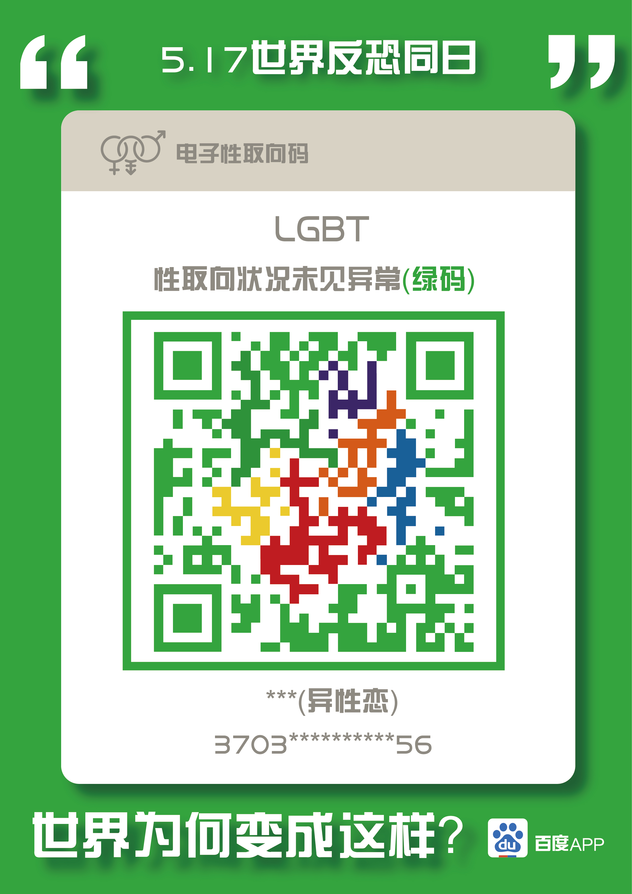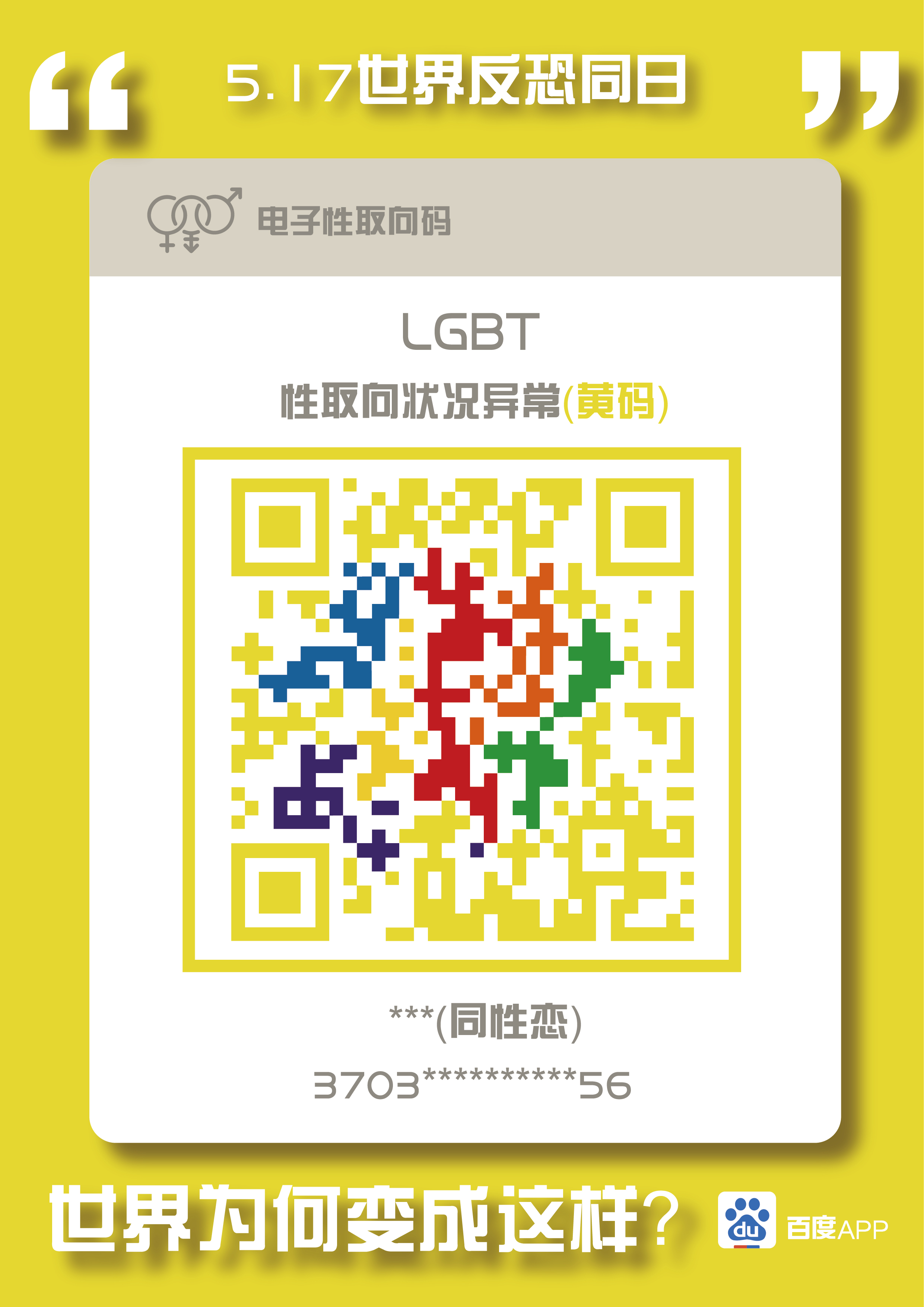 在此系列创意招贴海报中,整体形象使用了微信健康吗,健康状态改编成了性取向状况,同性恋设置成了“异常”的黄码形象,中间的二维码可以用手机扫取,扫去可以看到一张文字海报,海报内容为“同性恋不是疾病”
