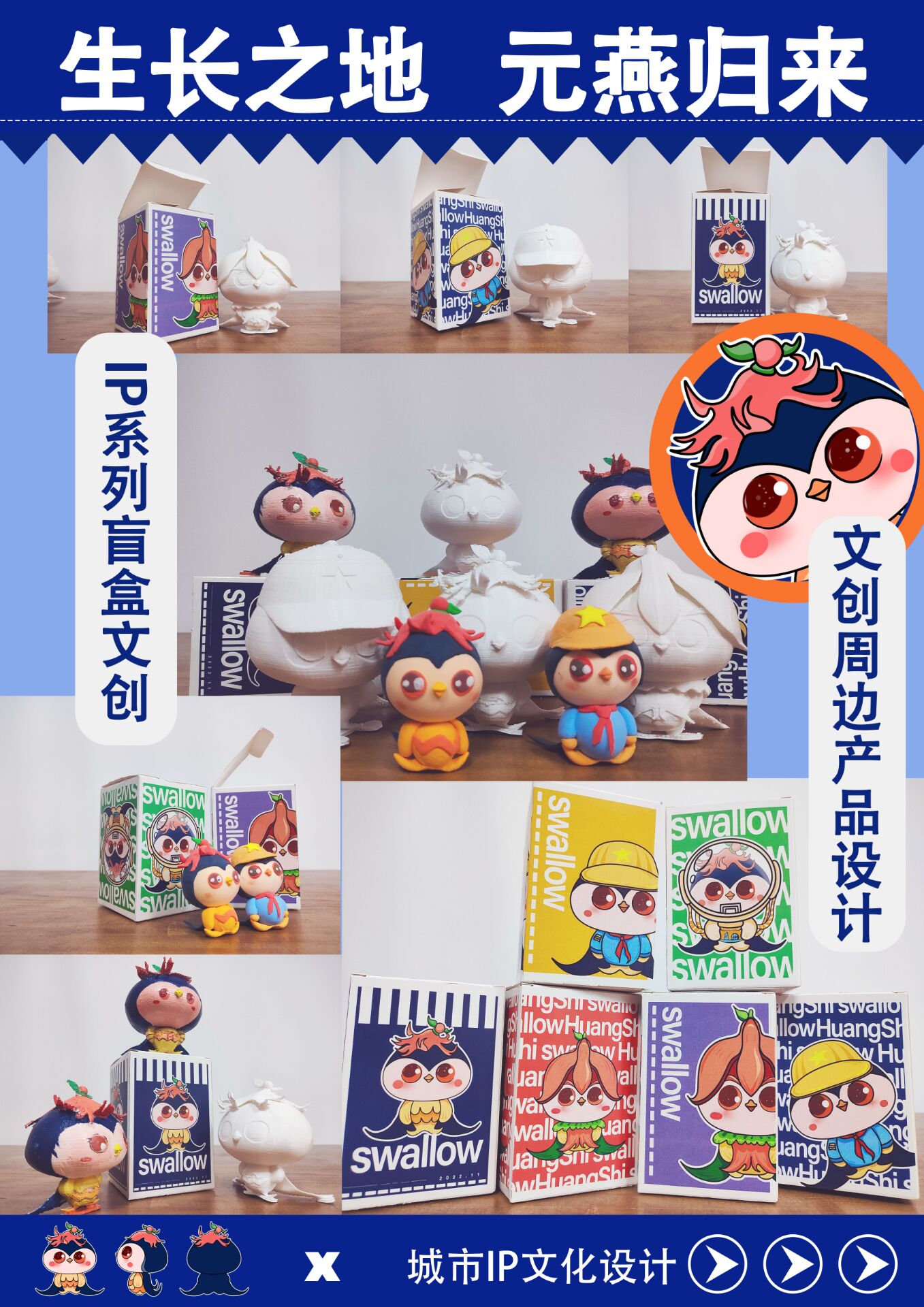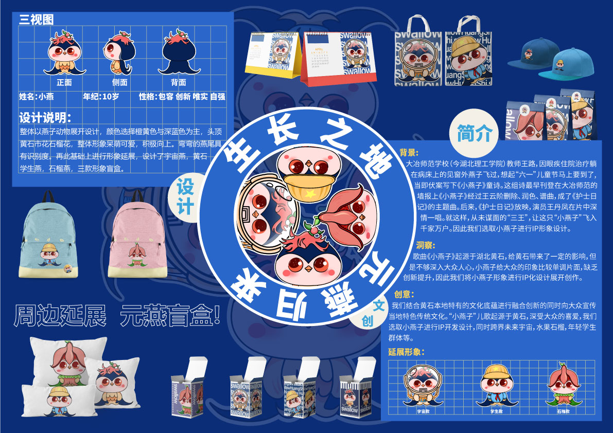 《生长之地 元燕归来》 1 165 0 IP插画 分享 歌曲《小燕子》起源于湖北黄石,给黄石带来了一定的影响,但是不够深入大众人心,小燕子给大众的印象比较单调片面,缺乏创新提升,因此我们将小燕子形象进行IP化设计,展开创作。 以当下火热的盲盒狂潮为基础,将小燕子进行盲盒文创的开发,让此IP产品流动于大众生活潮玩之中。 从学生以及年轻群体出发,进行元燕文创产品的系列开发。 赞一下 雨燕南归 ‹ › 发布