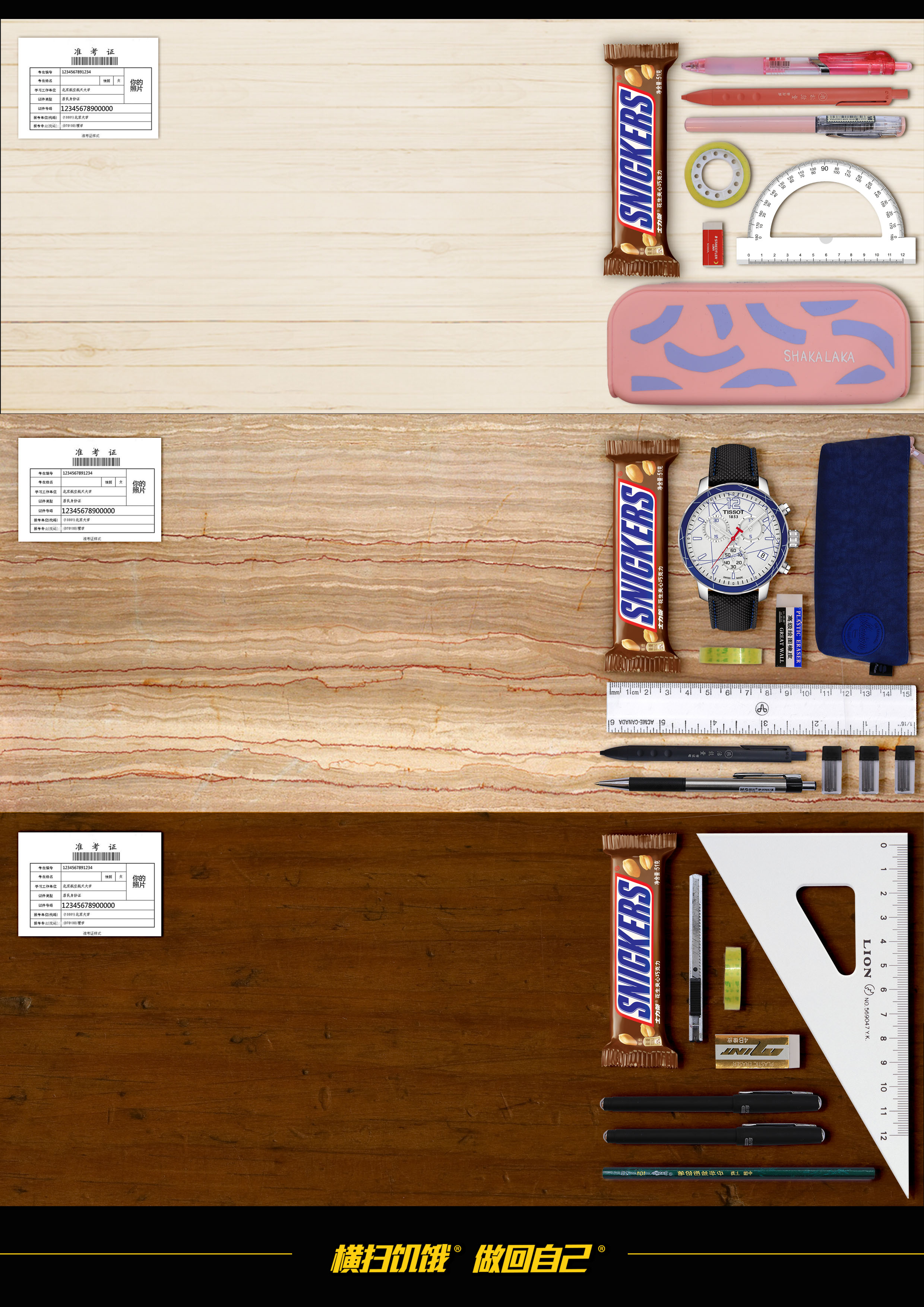 考试必备篇 922 2926 0 平面 分享 用考场中三张不同的桌子上,马上要参加考生们都会带着考试相关的用具,虽然用具各有不同,但士力架是人手必备的,是无法替换的,只能是士力架不能是别的巧克力产品 赞一下 光中耀 ‹ › 发布