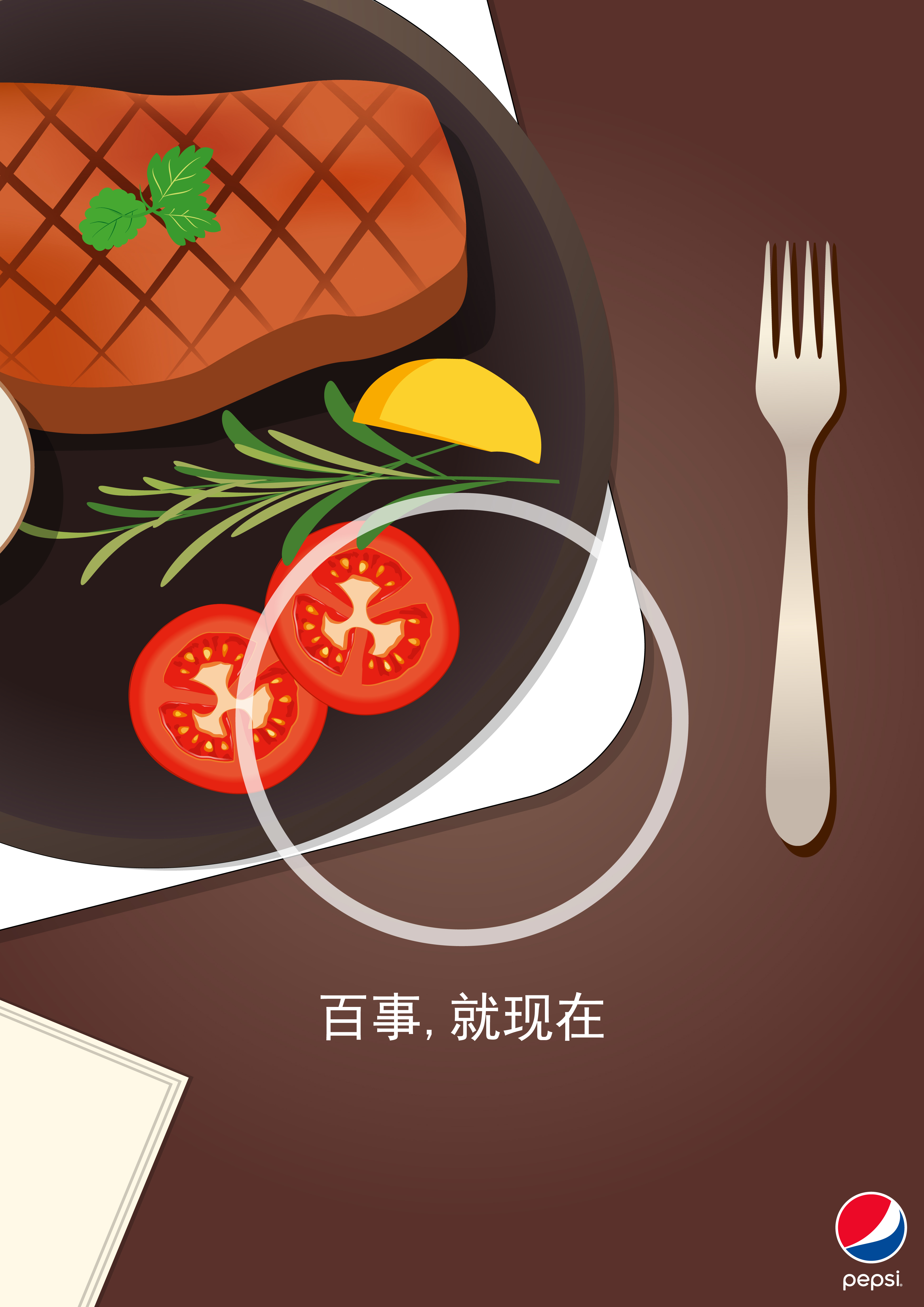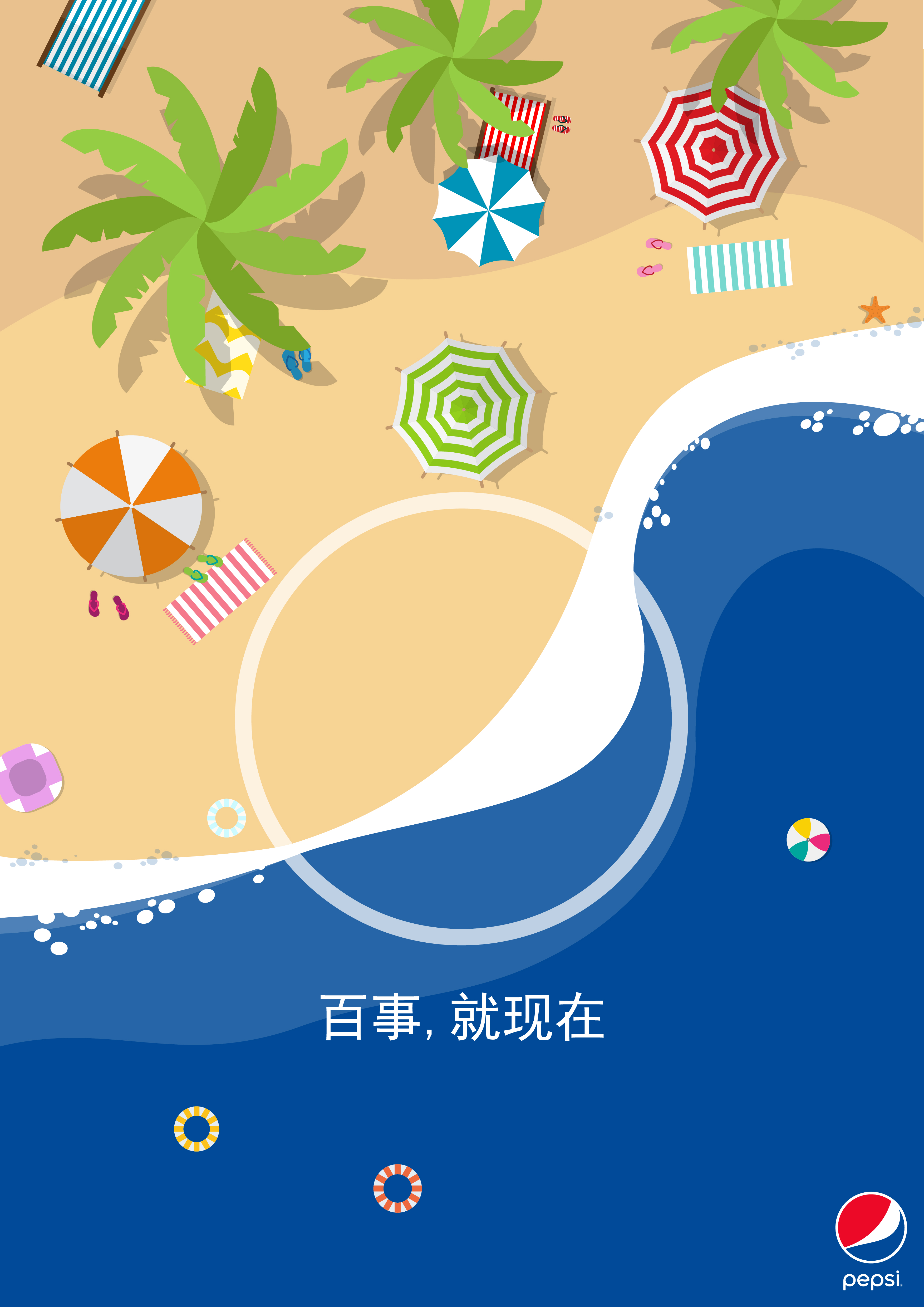 “百事,就现在”。可诠释为活在当下,享受与百事可乐的点滴。把百事的新logo,用同构的方式结合到生活中的大大小小数百件事情,比如度假、餐厅等。给大众灌输百事可乐的品牌形象,使百事可乐融入大众的生活中。“Live For Now”. Can be interpreted as living in the moment, enjoy and Pepsi drops. Put Pepsi's new logo in a coherent way, combining hundreds of things in life, such as vacations, restaurants, etc.. Instill the Pepsi brand image into the public and integrate Pepsi Cola into the public life.