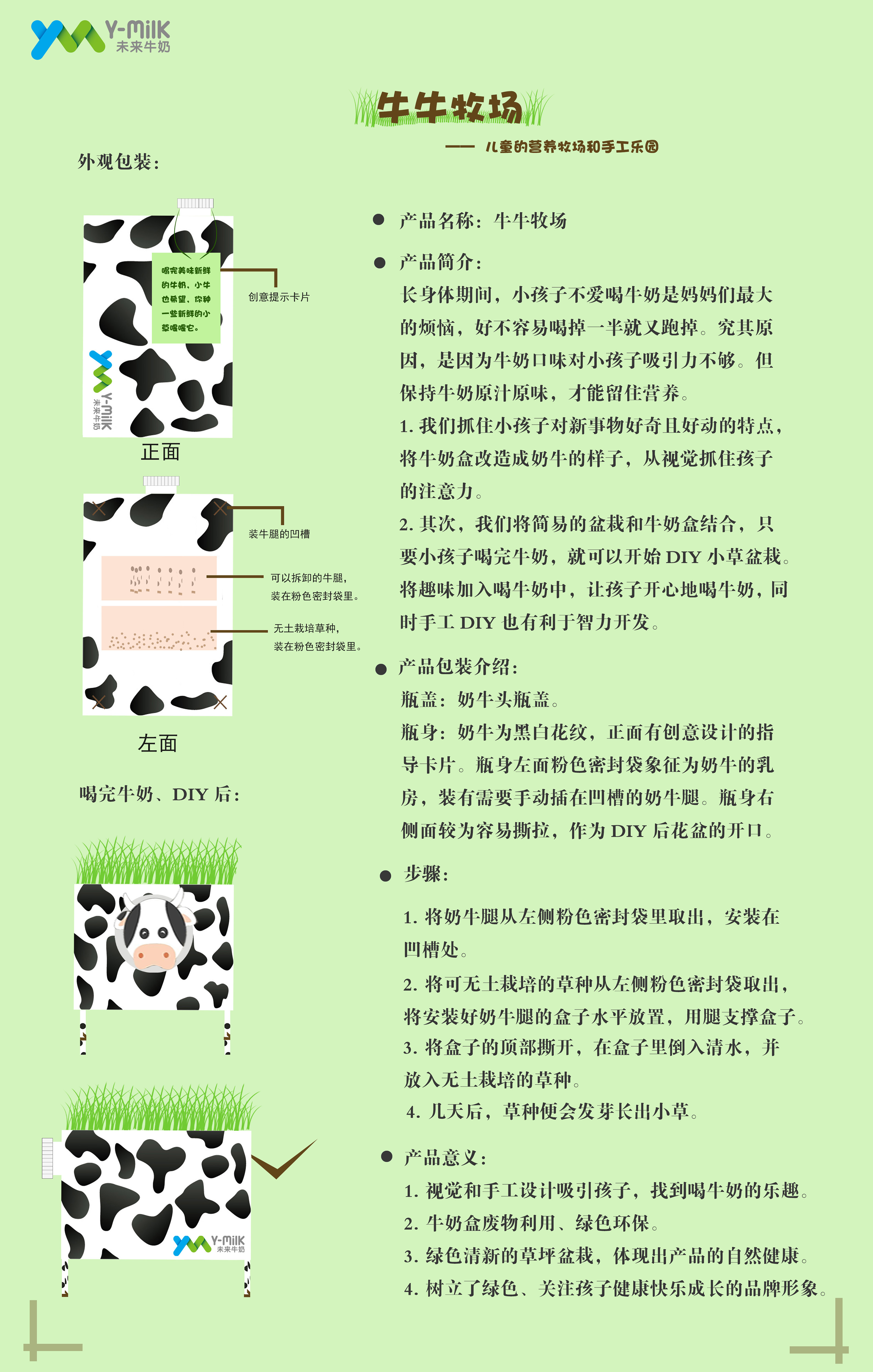 伊利 牛牛牧场——儿童的营养牧场和手工乐园 325 2217 0 产品设计 分享 为了解决孩子不爱喝牛奶的问题,创新了奶牛包装设计的小草盆栽,将趣味性融入其中,简单的操作,绿色的设计,废物利用环保健康。不仅解决了孩子喝牛奶的问题,更让孩子爱上喝牛奶,并且有利于智力开发,提高动手能力。同时绿色健康环保,更是体现了牛奶产品的原汁原味,树立了企业关心孩子成长健康,以及环境保护。 赞一下 甜蜜蜜 嘉兴市 关注 查看更多信息 ‹ › 发布