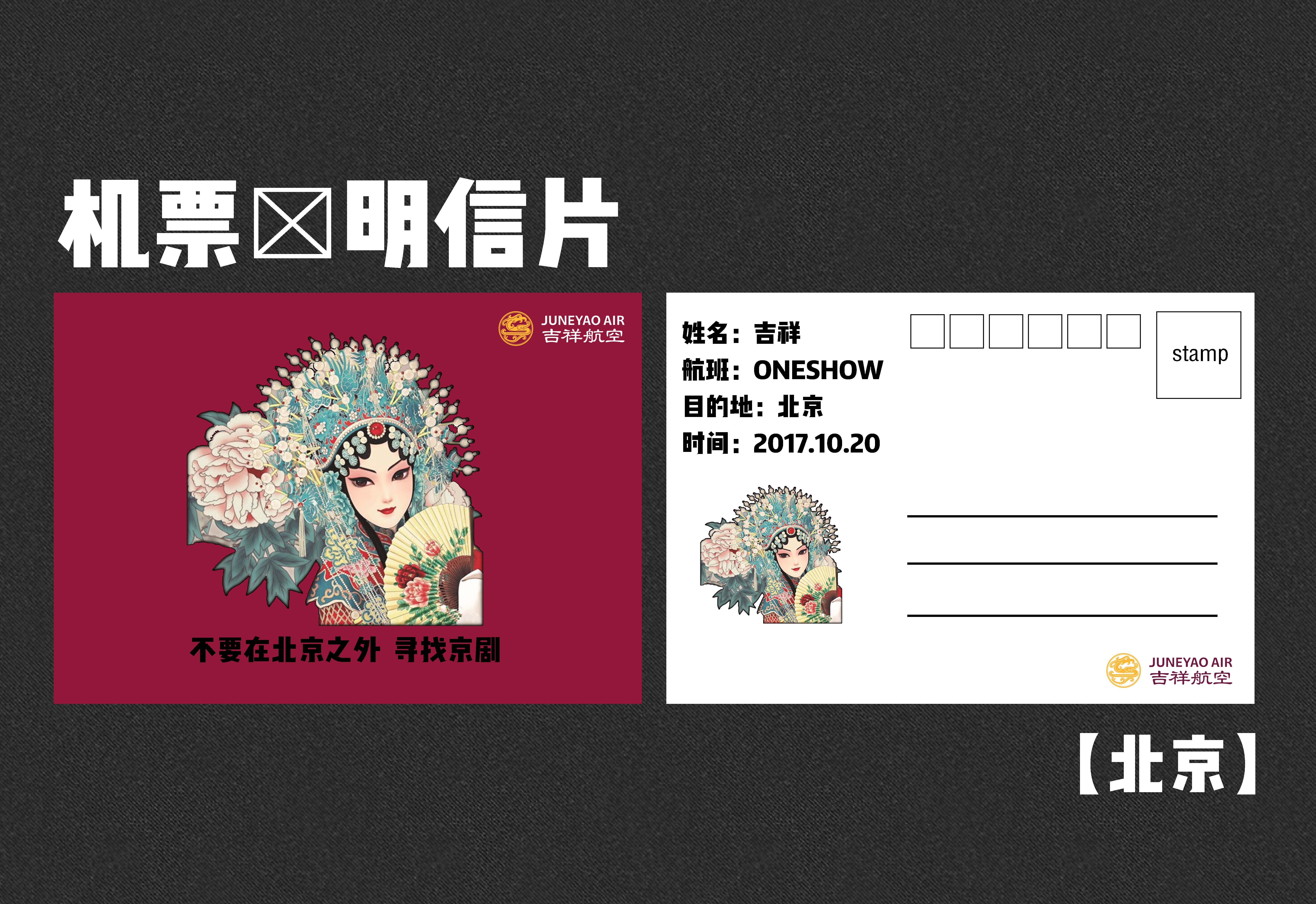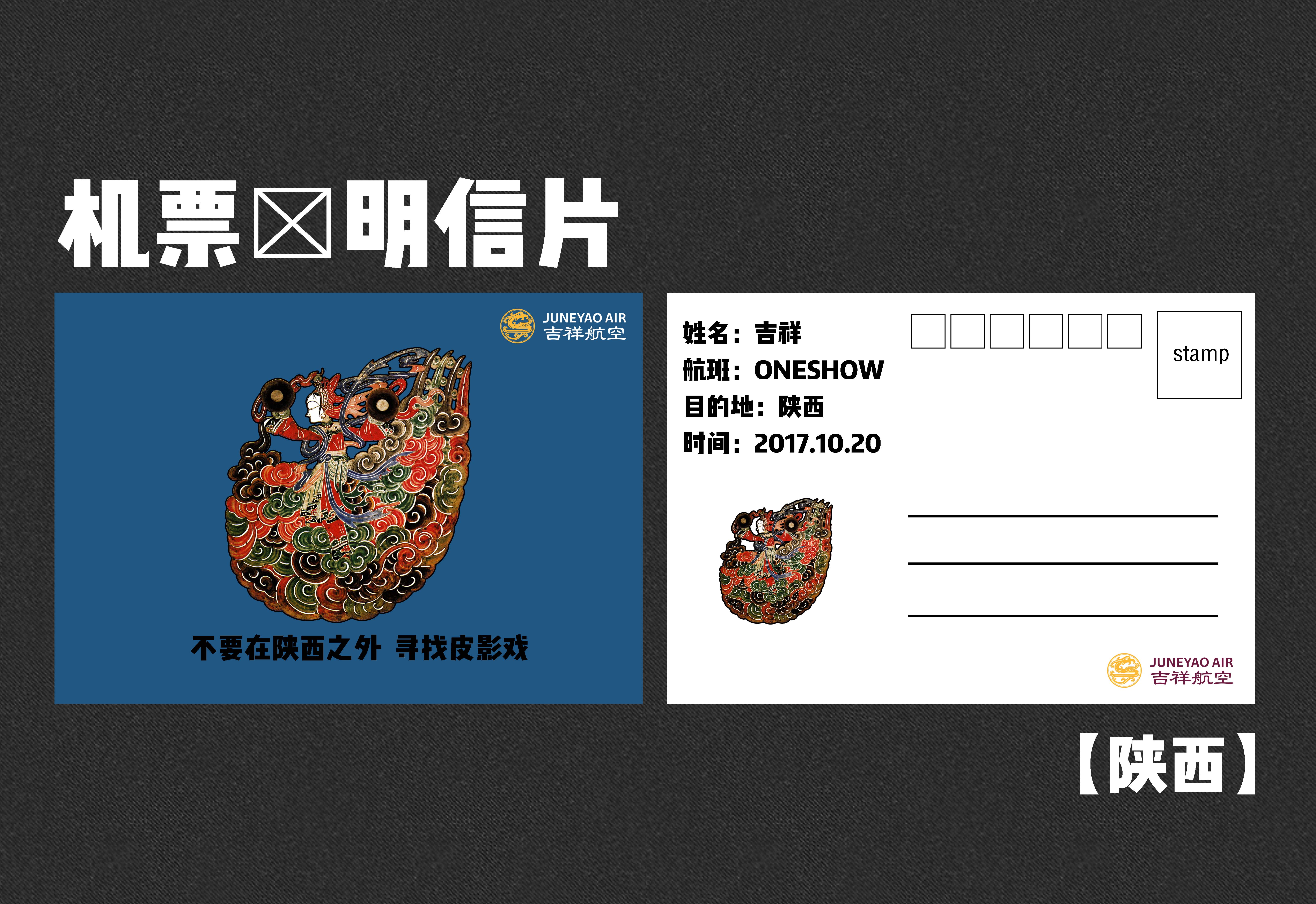 我们把机票与城市明信片相结合。机票即明信片,明信片即机票。在设计上,我们选取了北京、陕西、上海这三个城市的标志性文化产物作为明信片的设计基调;在内容上,不仅有旅客登机的基本信息,还有旅客去往该城市的文化标志以及slogan简介。为此,我们希望通过这样的设计,使得机票具有收藏价值,甚至旅客可以写上他(她)想要写的话寄给他方的亲人朋友。我们要让国内外旅客初步了解到这些城市的文化,甚至是激发他们对这些文化有更深入的了解的欲望。