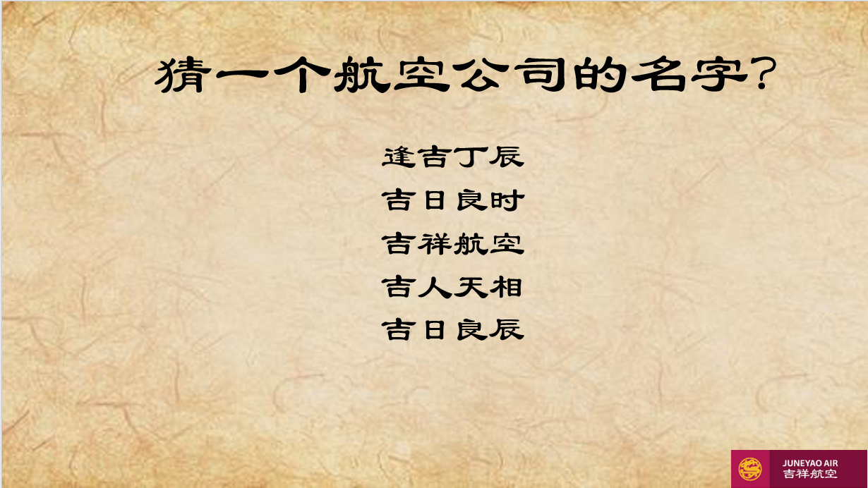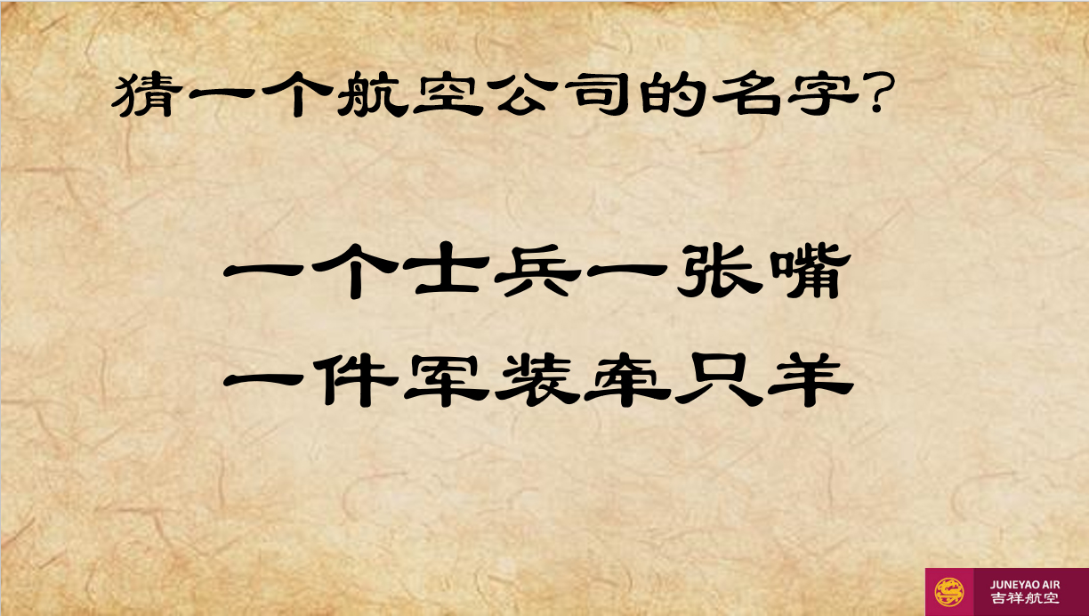 吉祥猜谜底 1179 2540 0 广告创新 分享 一个士兵就是吉字的士,下面一个口代表一张嘴,衣补旁所以是军装,右侧一个羊所以牵着一个羊。 其他的都是关于吉祥的成语,只有吉祥航空不是。 吉祥如意,所以就是吉祥航空。 赞一下 吃货小分队 ‹ › 发布