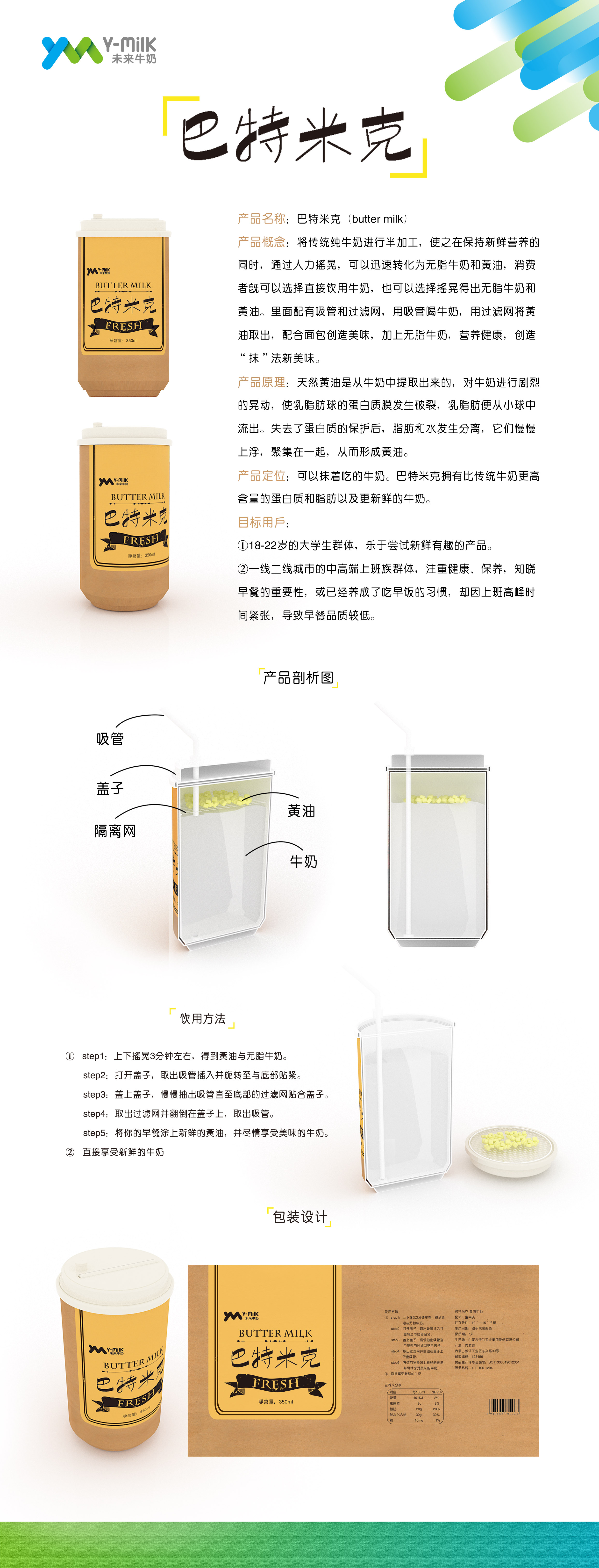 未来牛奶—巴特米克 1074 2467 0 产品设计 分享 将传统纯牛奶进行半加工,使之在保持新鲜营养的同时,通过人力摇晃,可以迅速转化为无脂牛奶和黄油,消费者既可以选择饮用纯牛奶,也可以选择饮用无脂牛奶,通过吸管直饮方便,也可以将黄油取出,配合面包创造美味,加上无脂牛奶,营养健康,创造“抹”法新美味。 赞一下 H&B ‹ › 发布