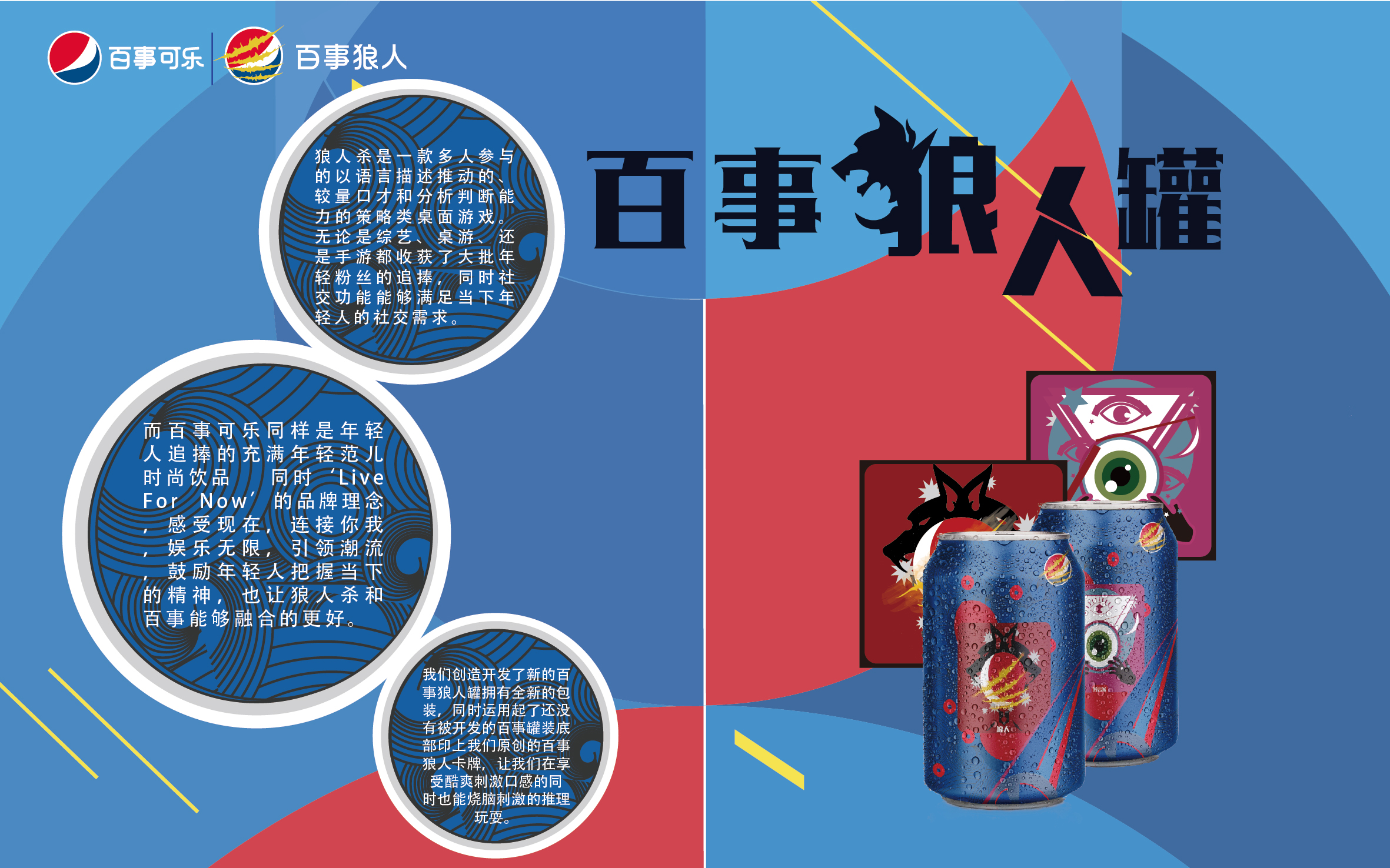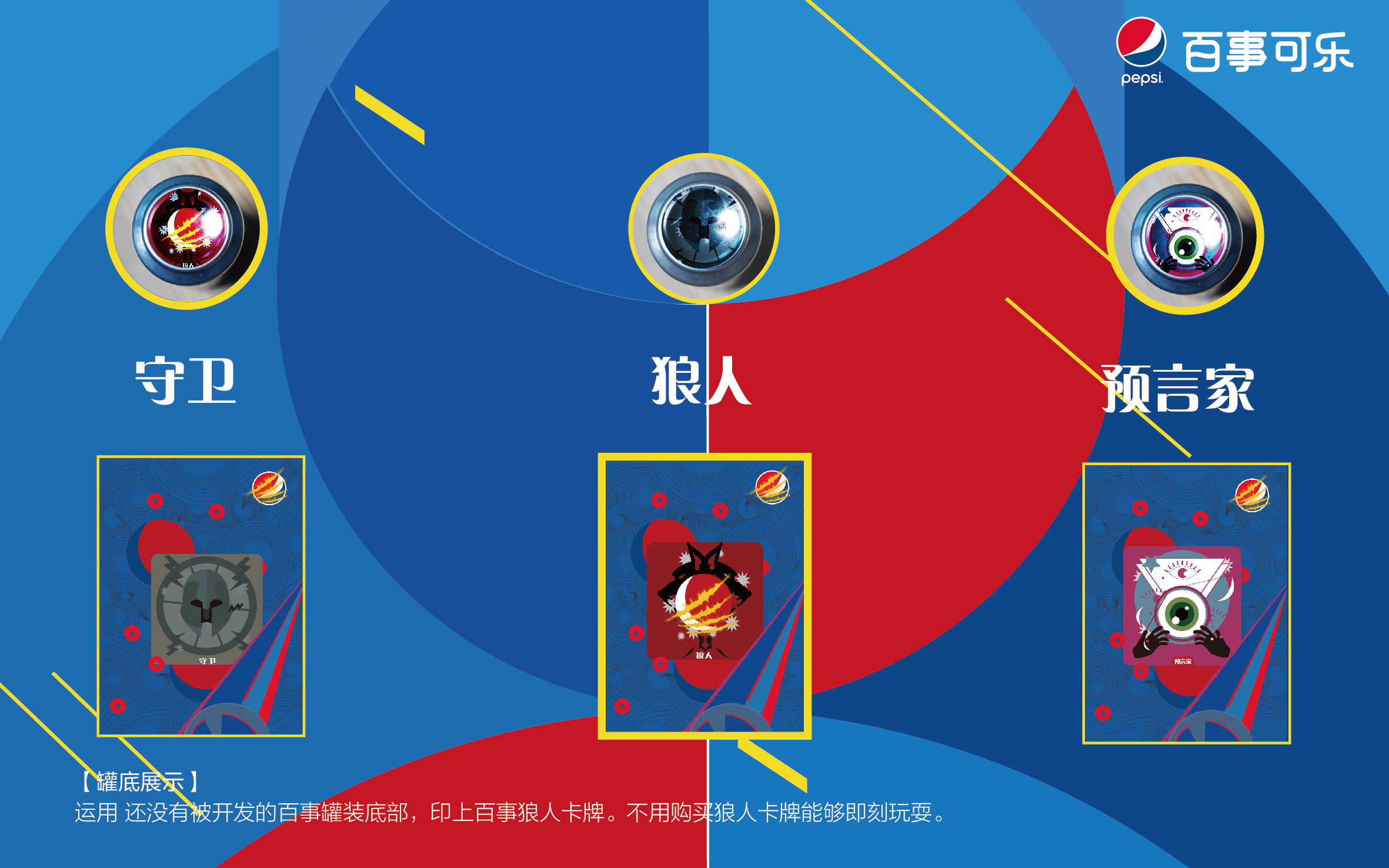 百事狼人罐 862 2497 0 产品设计 分享 我们创造开发了新的百事狼人罐拥有全新的包装,同时运用起了还没有被开发的百事罐装底部,印上我们原创的百事狼人卡牌,让我们在享受酷爽刺激口感的同时也能烧脑刺激的玩耍。 我们结合原创的百事狼人杀卡牌以及百事的经典元素创新了本产品的包装,超高的辨识度是我们产品的明显标签。 运用 还没有被开发的百事罐装底部,印上百事狼人卡牌。不用购买狼人卡牌能够即刻玩耍。 赞一下 百事狼人 ‹ › 发布
