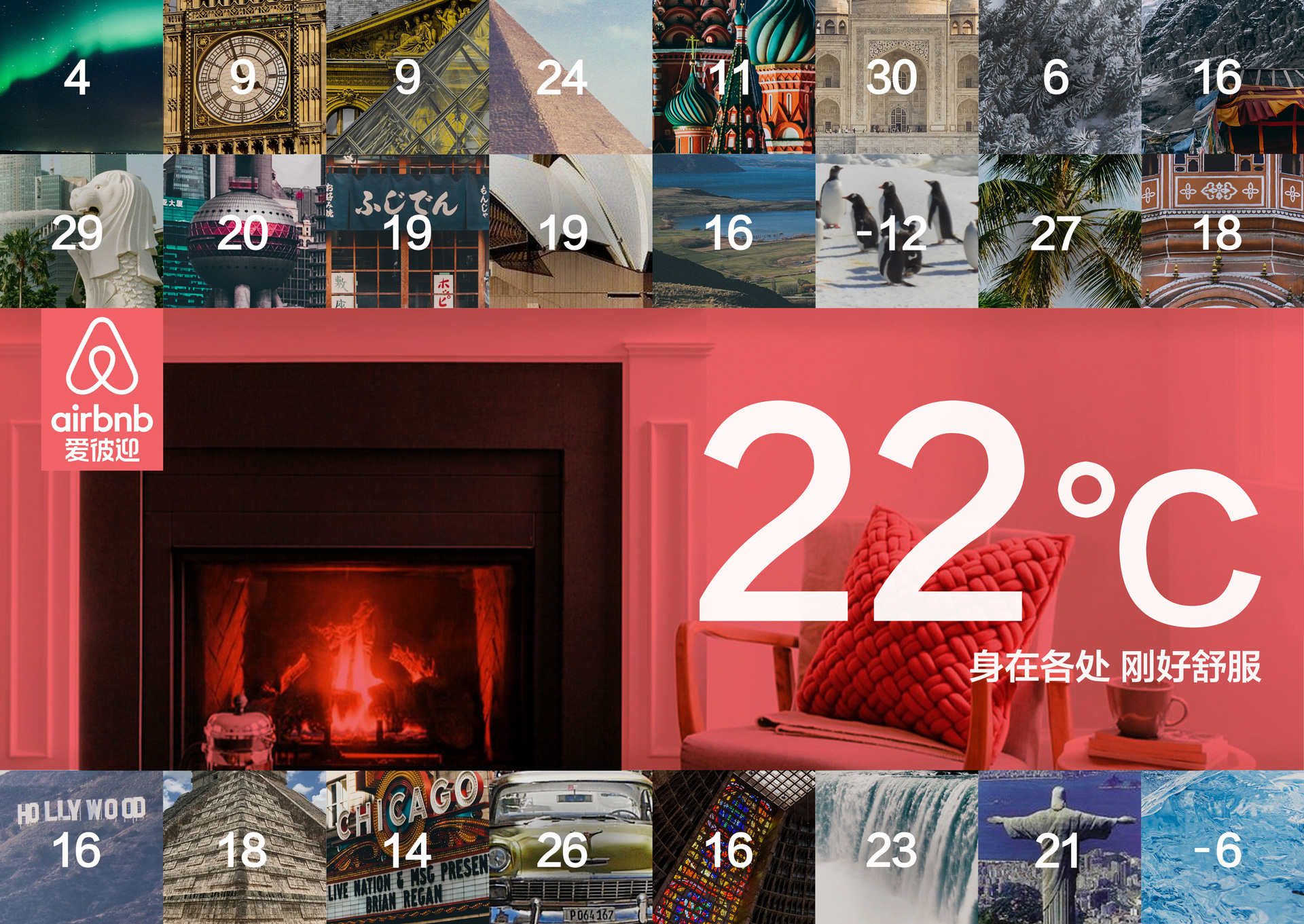全世界的爱彼迎,永远 22 °c 267 2302 0 平面 分享 将世界各地的变化气温与爱彼迎的恒温进行对比 22度是让人感觉到最舒适的环境温度 突出旅行带给人的舒适性 重新定义旅行,从感受“舒服”开始 赞一下 南北手脑 ‹ › 发布