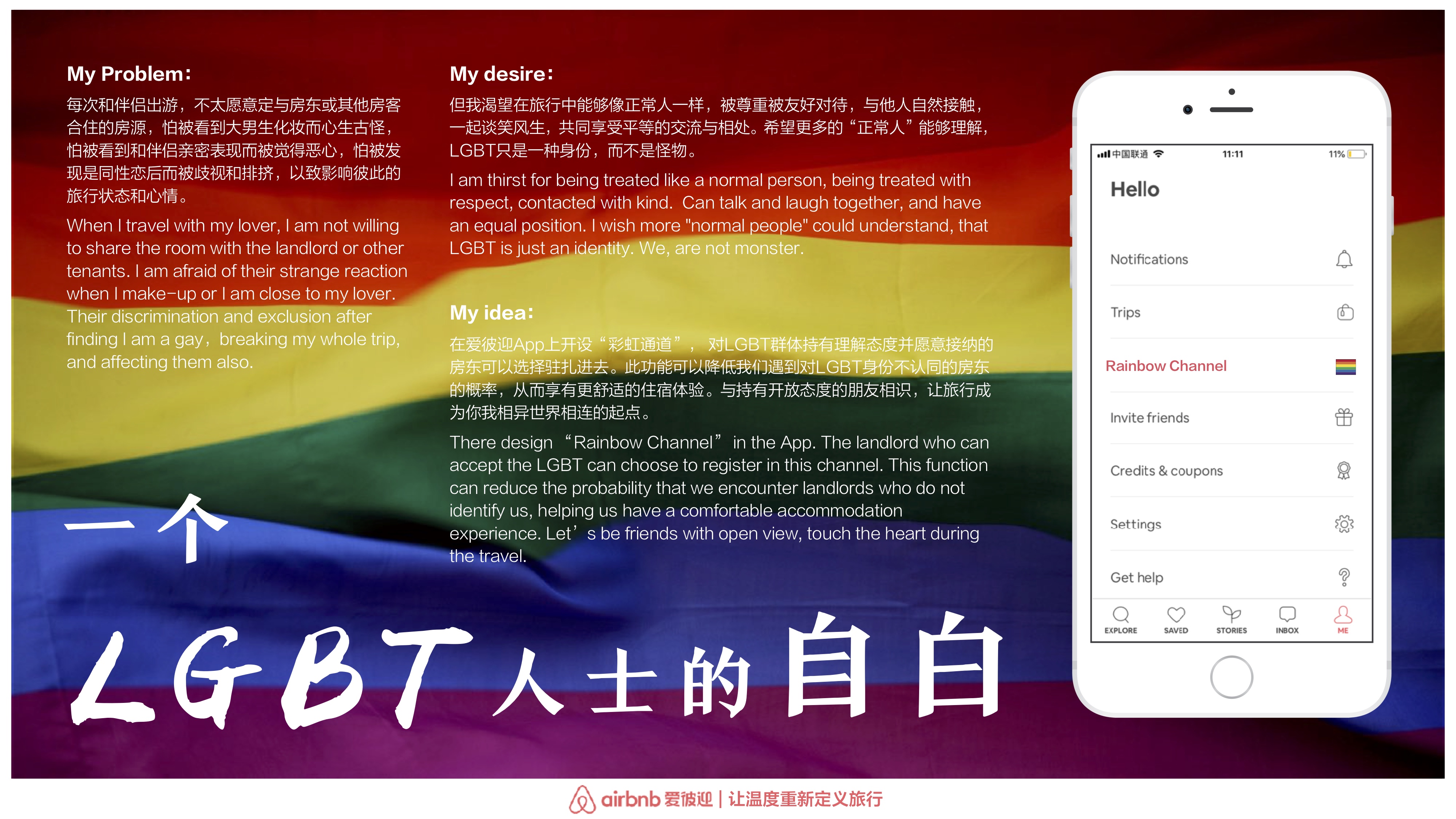 据统计,目前中国大致有4000 万至 7000 万的LGBT人群,这群生活在街角社会,跟身边人有着不同性取向、情感诉求的人,多数时候只能隐藏真实的自己,甚至有时在旅行中他们也不能完全享受整个过程,他们害怕在住宿过程中遇到来自房东或其他房客异样的眼光与不被接纳的态度。但事实上,他们比其他很多人都更需要得到外部世界的理解,尊重和接纳。而接触是理解的第一步,我们希望为其营造一个双向舒适和安全的空间,让LGBT群体能够与持有开放态度的朋友自然接触,一起谈笑风生,共同享受平等的交流与相处,让旅行成为LGBT群体与其他人相连的起点。