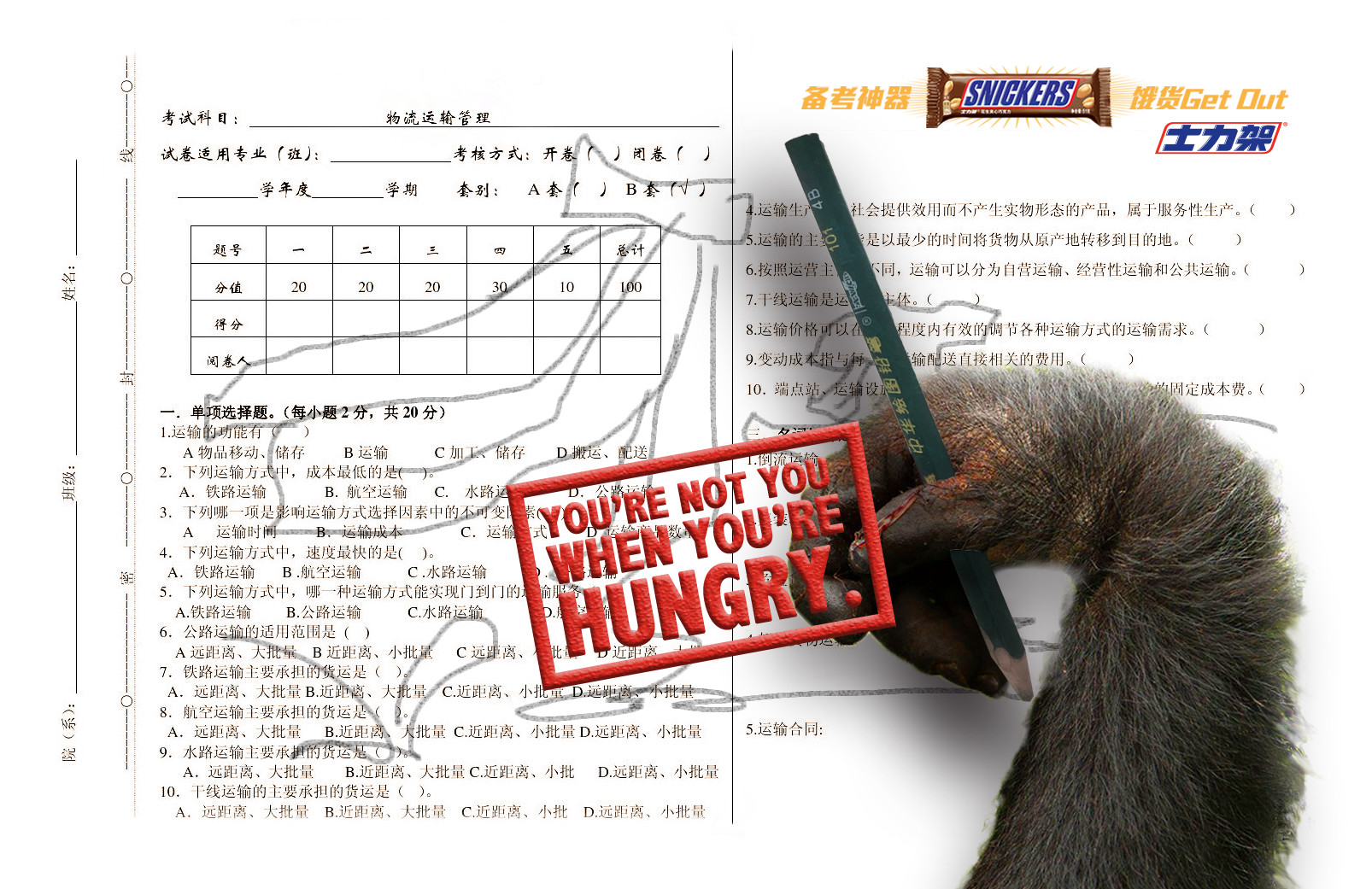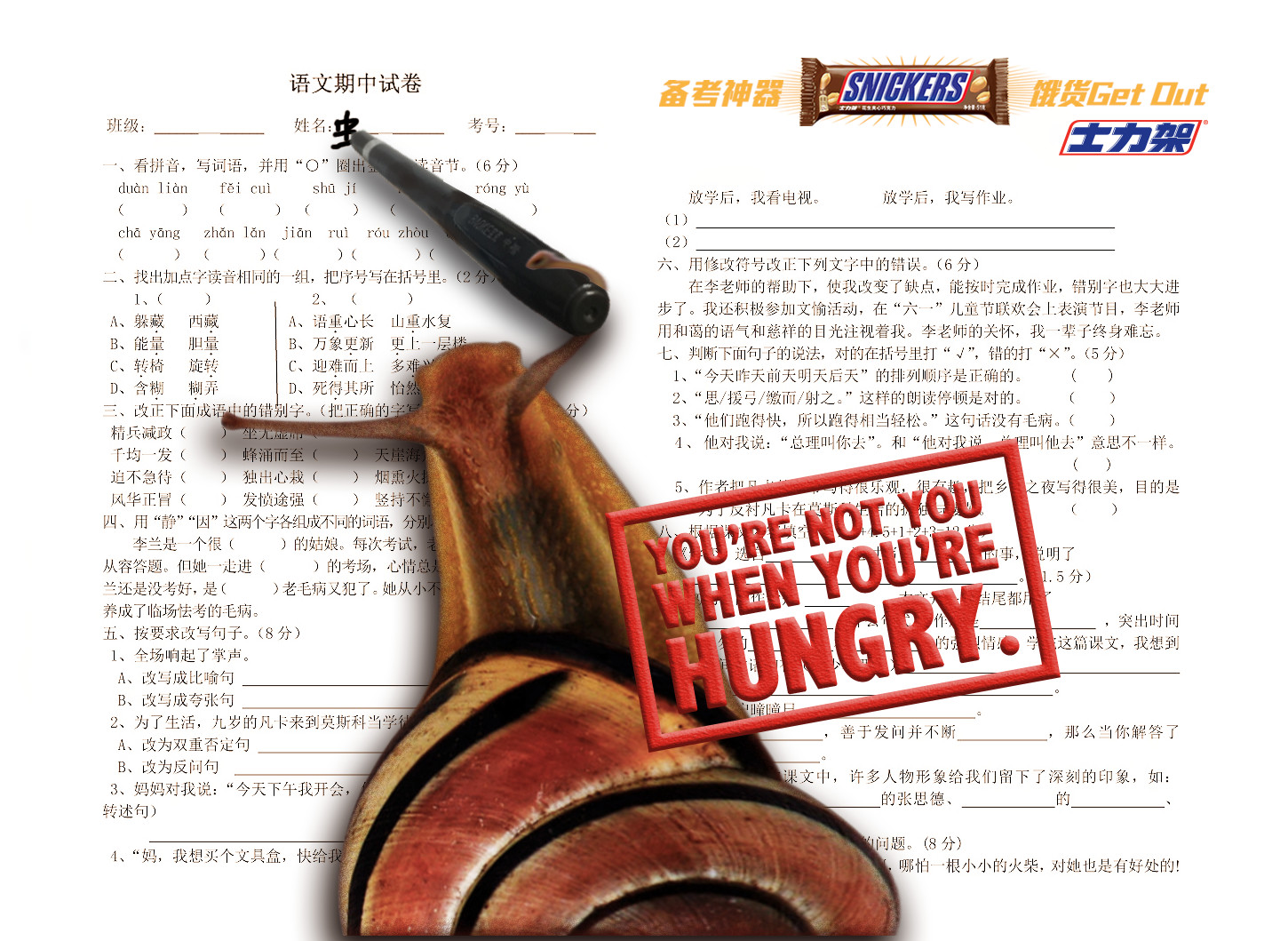 到你感到饥饿时,是否行动迟缓浑身无力?你会、蜗牛也会。 本稿表现出当你饥饿时你可能会像蜗牛一样行动迟缓、浑身乏力,导致无法发挥正常考试水平。 所以记得要吃备考神器 饿货Get Out——士力架