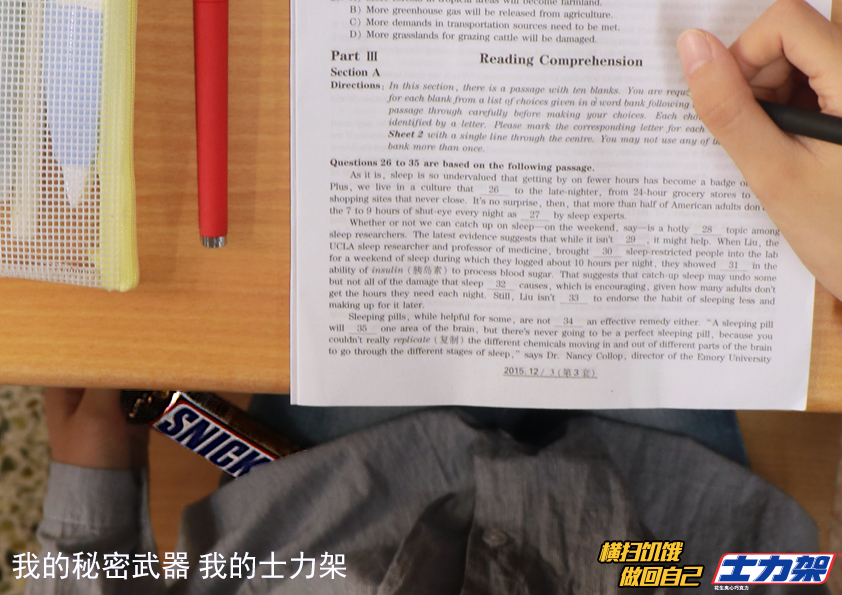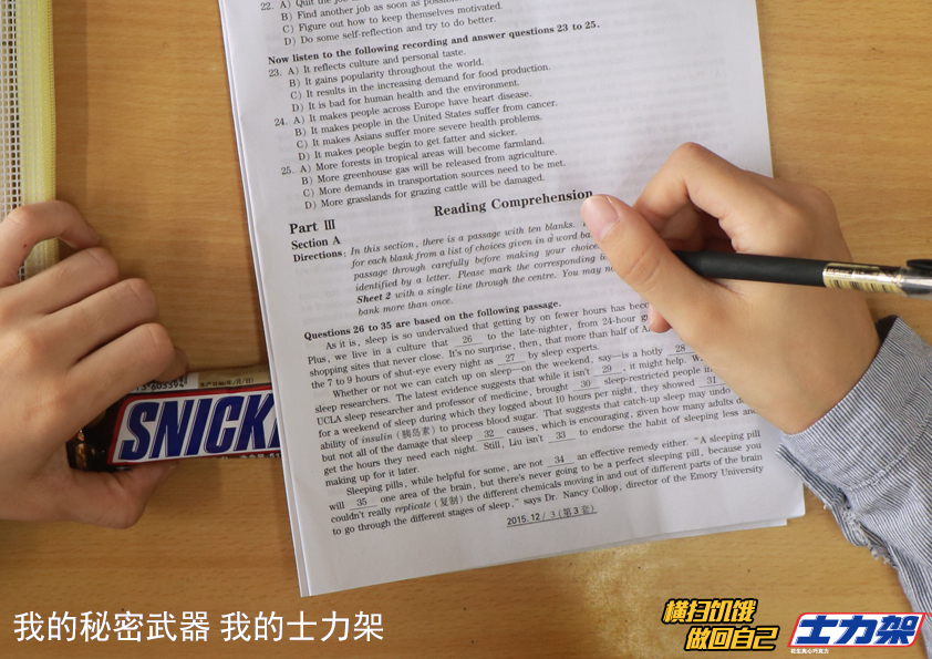 从考卷下拿出我的秘密武器!这动作一般是拿小抄才会有的,但是把士力架代入其中,大家一看就明白了其中的含义,有了士力架就像开了挂(作弊)一样