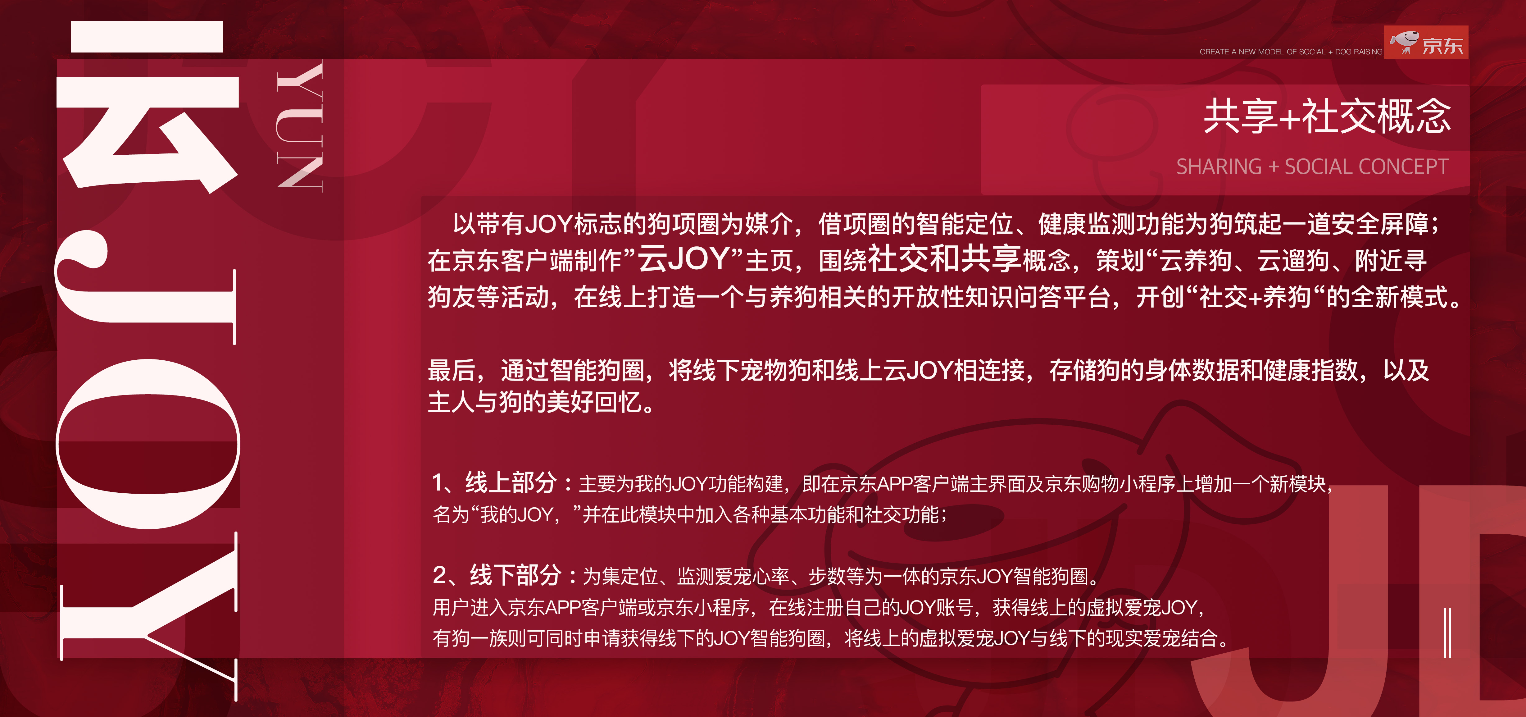 线上: 社交——云遛狗、云寄养、云匹配 遛狗之后、帮忙养了之后——获得京东豆