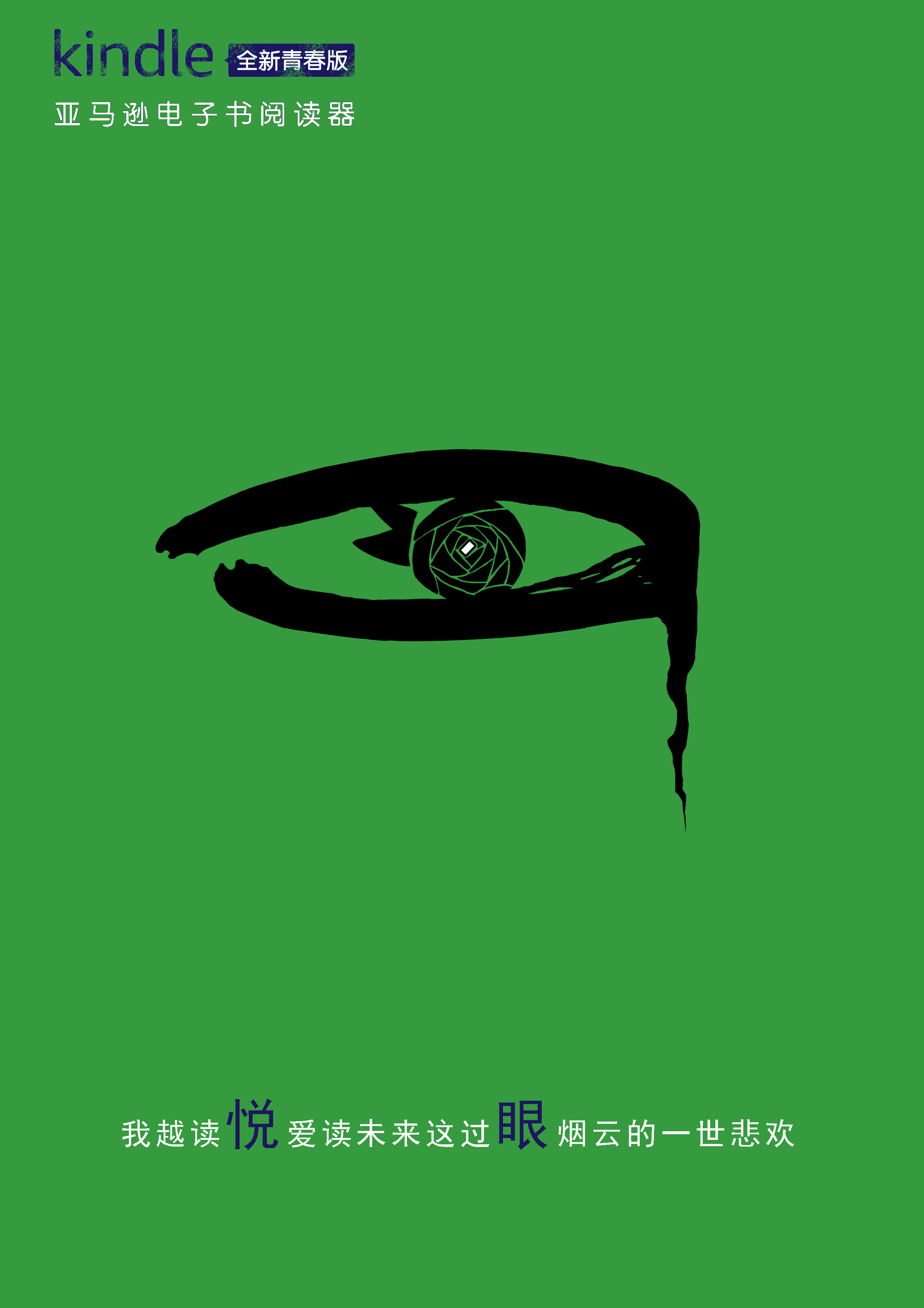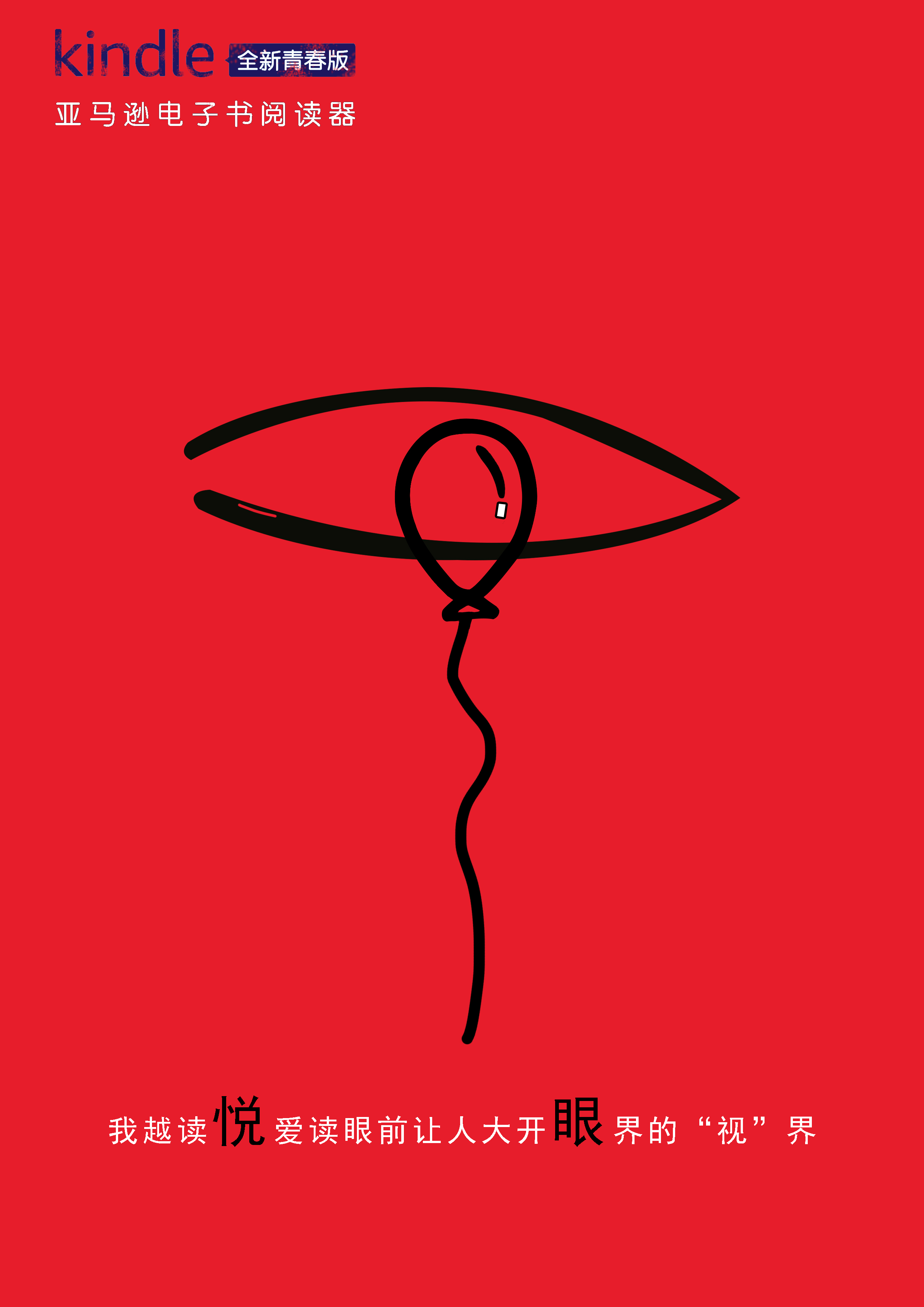图二由眼睛、地球、kindle产品样式三个元素组成,世界就在我们眼中,但我们眼中的世界总是不停的在给予我们惊喜,加上kindle元素,可以表现出kindle让我们另眼相看的“视”界。