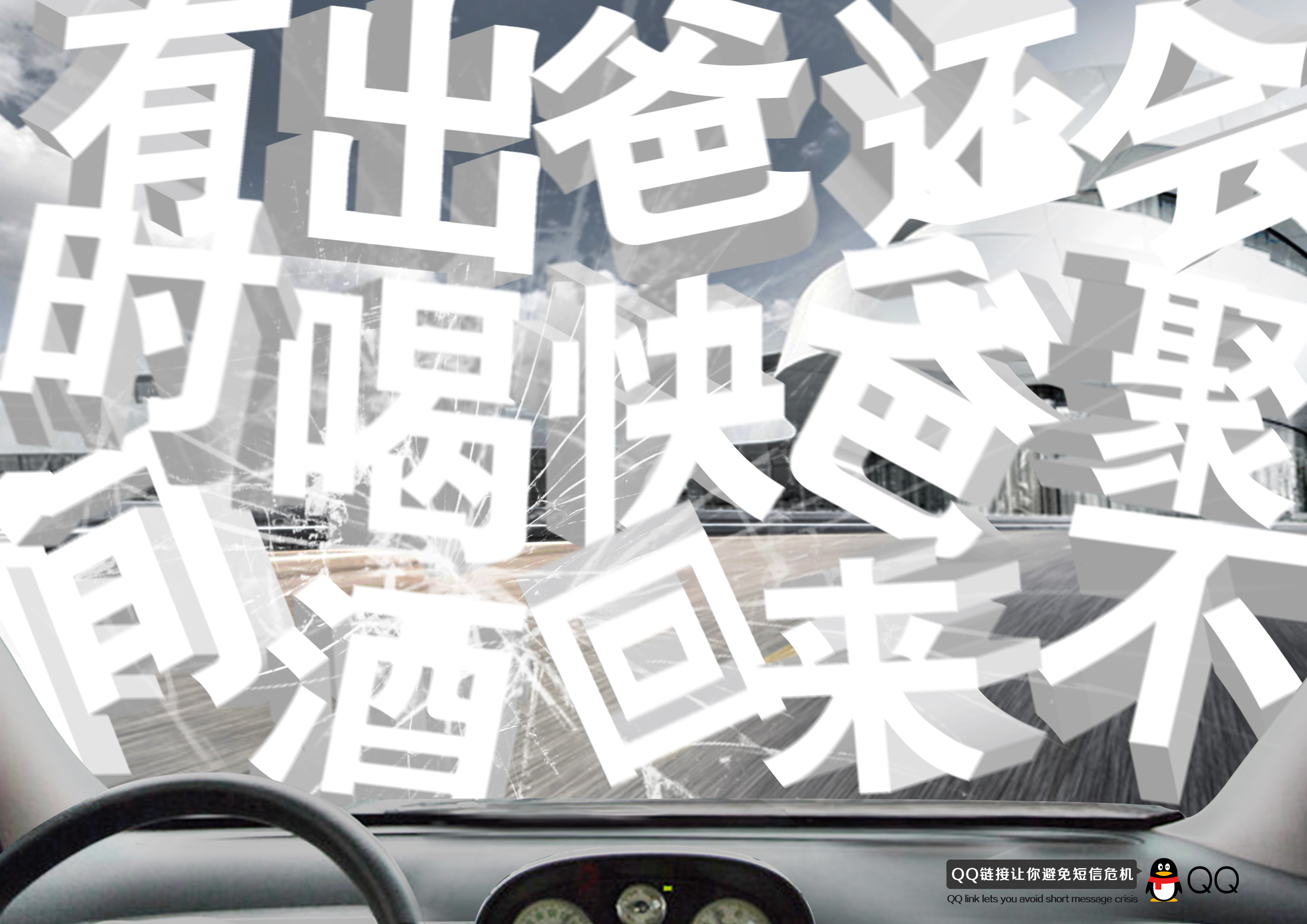 本次作品以生活中上班回家以及外出聚会等生活话题是短信交流常用的用语,通过把“字体”作为表现元素,将“字体”做成大字篇布满化身成“阻碍视线、分散注意力”的妨碍物遮挡砸碎了前风玻璃,寓意警示带来的生命危险的后果,导致马路危险重重,不要在开车中发短信,QQ连接即时通讯的功能,使在行车中驾驶人避免了短信危机,使QQ通信的普及使现代人生活中加强了联系、开车中减少了注意力以及驾驶疲劳的发生、减轻负担,开启融入生活的乐趣,使驾驶人得到了帮助。