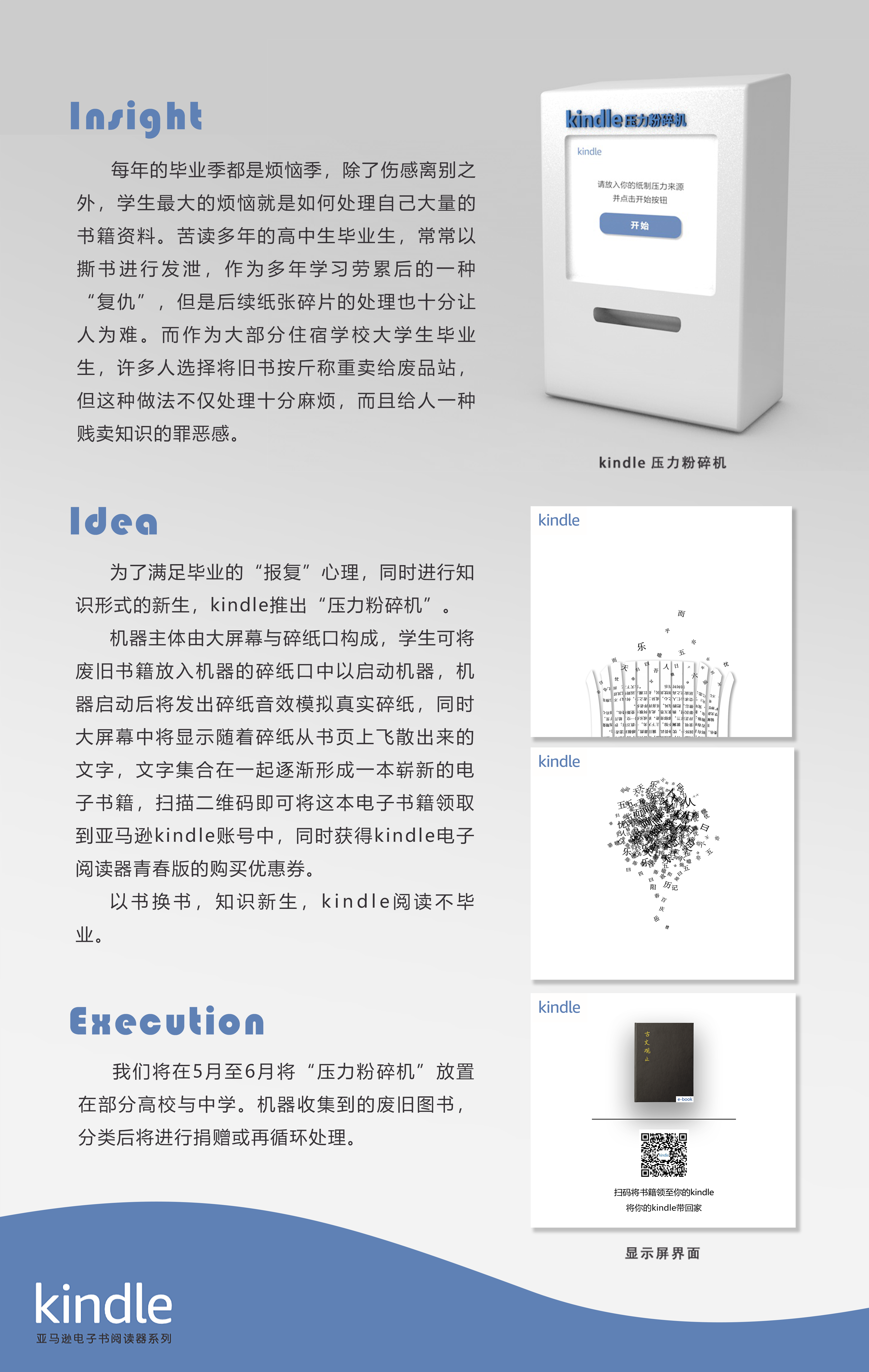 为了满足毕业的“报复”心理,同时进行知识形式的新生,kindle推出“压力粉碎机”。 机器主体由大屏幕与碎纸口构成,学生可将废旧书籍放入机器的碎纸口中以启动机器,机器启动后将发出碎纸音效模拟真实碎纸,同时大屏幕中将显示随着碎纸从书页上飞散出来的文字,文字集合在一起逐渐形成一本崭新的电子书籍,扫码即可将这本电子书籍领取到亚马逊kindle账号中,同时获得kindle电子阅读器青春版购买优惠券。以书换书,kindle阅读不毕业。 5月至6月将放置“压力粉碎机”在部分高校与中学中。同时机器收集到的废旧图书,分类后将进行捐赠或再循环处理。