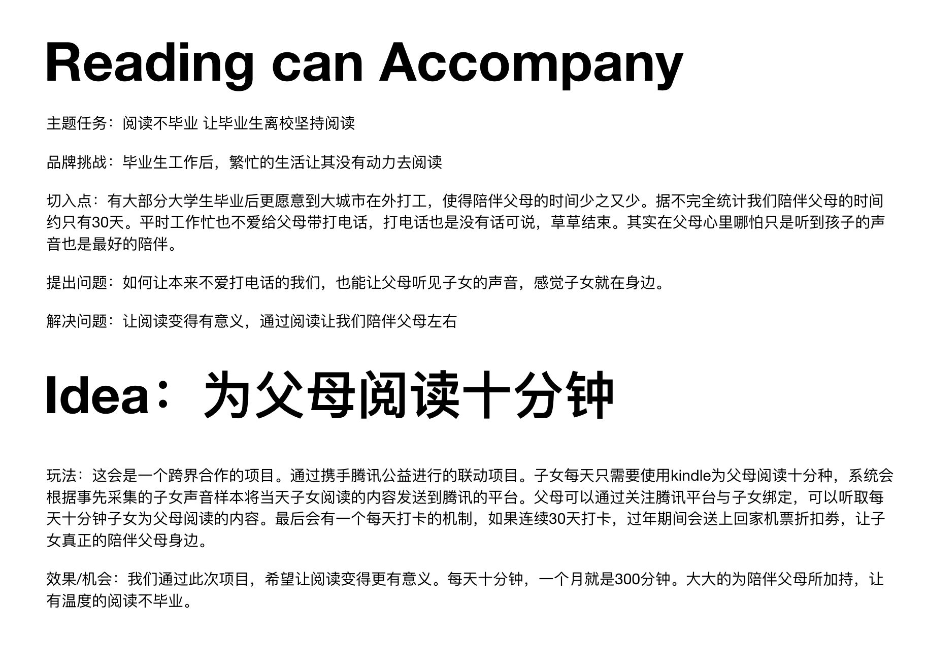 主题任务:阅读不毕业 让毕业生离校坚持阅读 品牌挑战:毕业生工作后,繁忙的生活让其没有动力去阅读 切入点:有大部分大学生毕业后更愿意到大城市在外打工,使得陪伴父母的时间少之又少。据不完全统计我们陪伴父母的时间约只有40天。平时工作忙也不爱给父母带打电话,打电话也是没有话可说,草草结束。其实在父母心里哪怕只是听到孩子的声音也是最好的陪伴。 提出问题:如何让本来不爱打电话的我们,也能让父母听见子女的声音,感觉子女就在身边。 解决问题:让阅读变得有意义,通过阅读让我们陪伴父母左右 Idea:为父母阅读十分钟 玩法:这会是一个跨界合作的项目。通过携手腾讯公益进行的联动项目。子女每天只需要使用kindle为父母阅读十分种,系统会根据事先采集的子女声音样本将当天子女阅读的内容发送到腾讯的平台。父母可以通过关注腾讯平台与子女绑定,可以听取每天十分钟子女为父母阅读的内容。最后会有一个每天打卡的机制,如果连续30天打卡,过年期间会送上回家机票折扣劵,让子女真正的陪伴父母身边。 效果/机会:我们通过此次项目,希望让阅读变得更有意义。每天十分钟,一个月就是300分钟。大大的为陪伴父母所加持,让有温度的阅读不毕业。