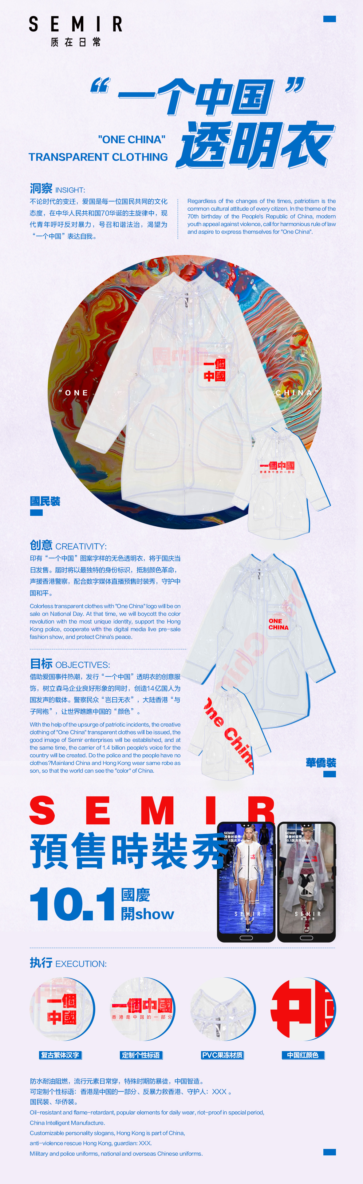 “一个中国”透明衣 1 153 0 服装、平面 分享 借助爱国事件热潮,发行“一个中国”透明衣的创意服饰,树立森马企业良好形象的同时,创造14亿国人为国发声的载体。 赞一下 OOOOOOMPH ‹ › 发布