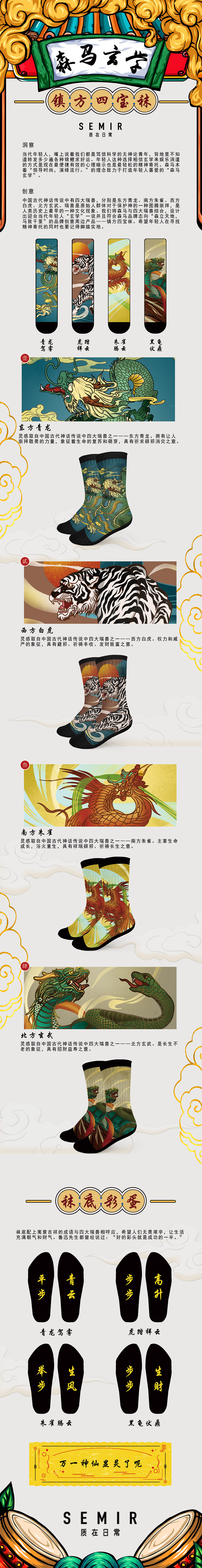 当代年轻人,嘴上说着我们都是笃信科学的无神论青年,背地里不知道转发多少遍各种锦鲤求好运。年轻人这种选择相信玄学来娱乐消遣的方式是现在最便捷有效的心理暗示也是最轻松的精神寄托。森马本着“领导时尚,演绎流行。”的理念致力于打造年轻人喜爱的“森马玄学”。中国古代神话传说中有四大瑞兽,分别是东方青龙、南方朱雀、西方白虎、北方玄武。瑞兽是原始人群体对于保护神的一种图腾崇拜,是人类历史上最早的一种文化现象。我们将森马与四大瑞兽结合,设计出迎合当代年轻人“玄学”一说并且符合森马品牌志向“森立天地,马致千里”的品牌创意周边产品——镇方四宝袜。希望年轻人在寻找精神寄托的同时也要记得脚踏实地。