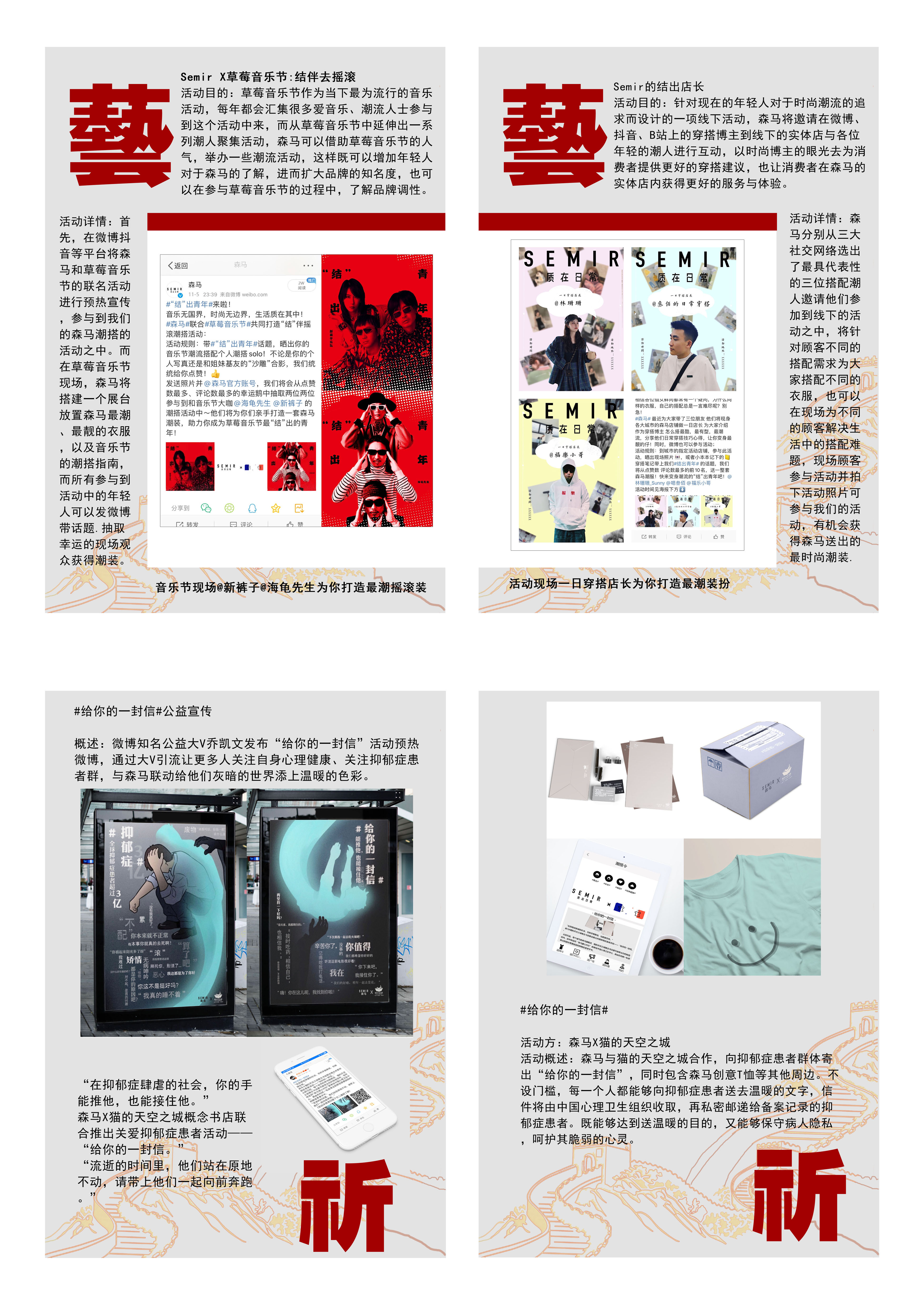 艺时代在不断向前变化,作为结出青年就要不断创新,在这个阶段我们主要是将semir与草莓音乐节等做了一些列的联名活动,把中国结所代表的意义与现实生活相结合,将传统与潮流相结合,共同打造又潮又结出的有为青年。 祈中国结所代表的团结要落到关心与关爱同伴的实事上,森马作为社会责任感极强的企业,号召所有青年团结起来,为需要爱的人做出我们应做的,因此选择了自闭症群体作为公益对象,并与猫的天空之城做联名,共同关爱自闭症群体,也能够体现“结”之本意。