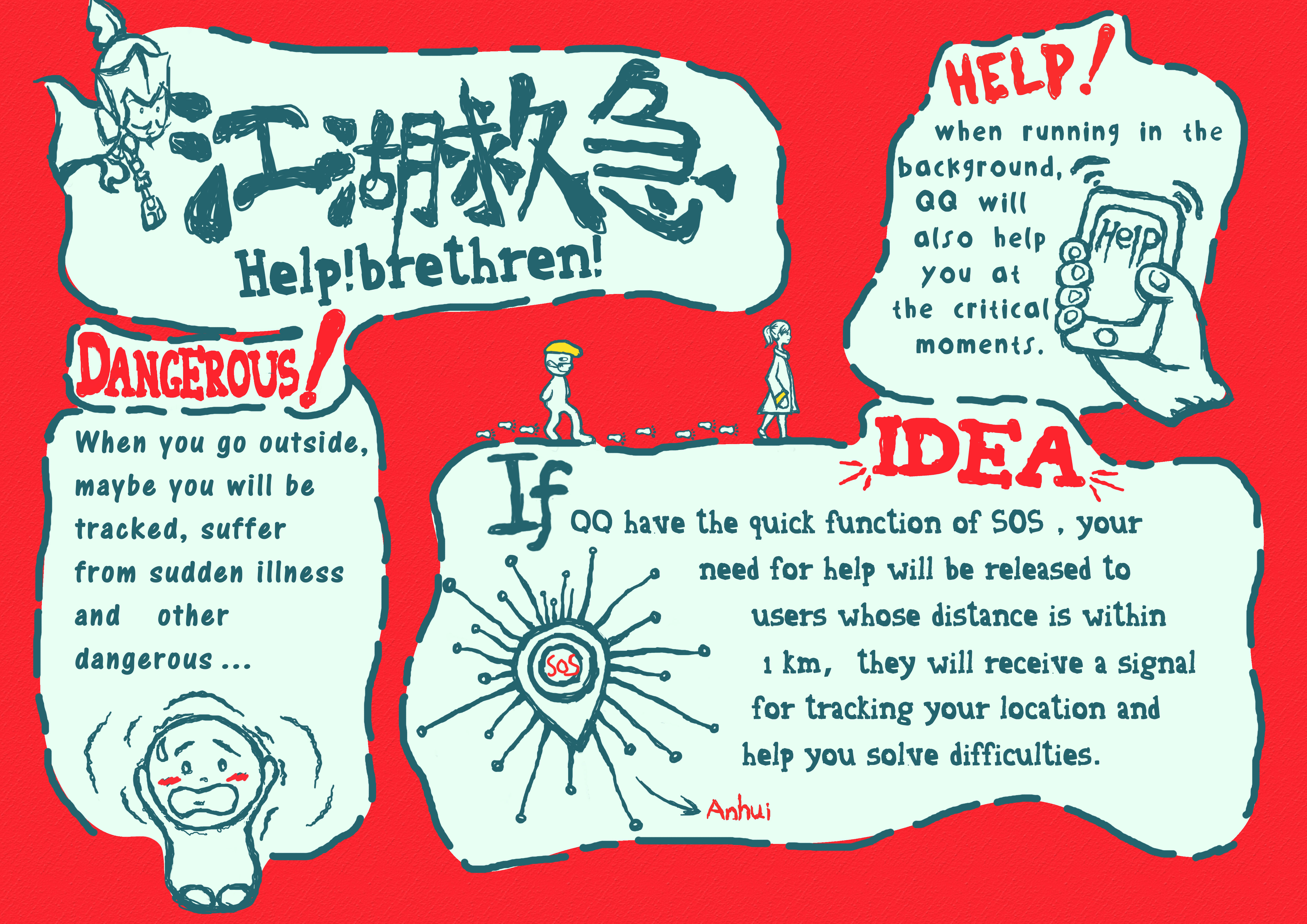 QQ 江湖救急 464 3066 0 广告 产品 创意 分享 基于现在QQ用户使用的现状,我们在qq内部内置一个紧急求助快捷功能,在你遇到被跟踪等危险或者需要帮助时你就可以启用,周围的QQ用户和你的家人就会收到求救信息,从而跟踪定位你的所在位置,来帮助你度过危险。 赞一下 青晨工作室 ‹ › 发布