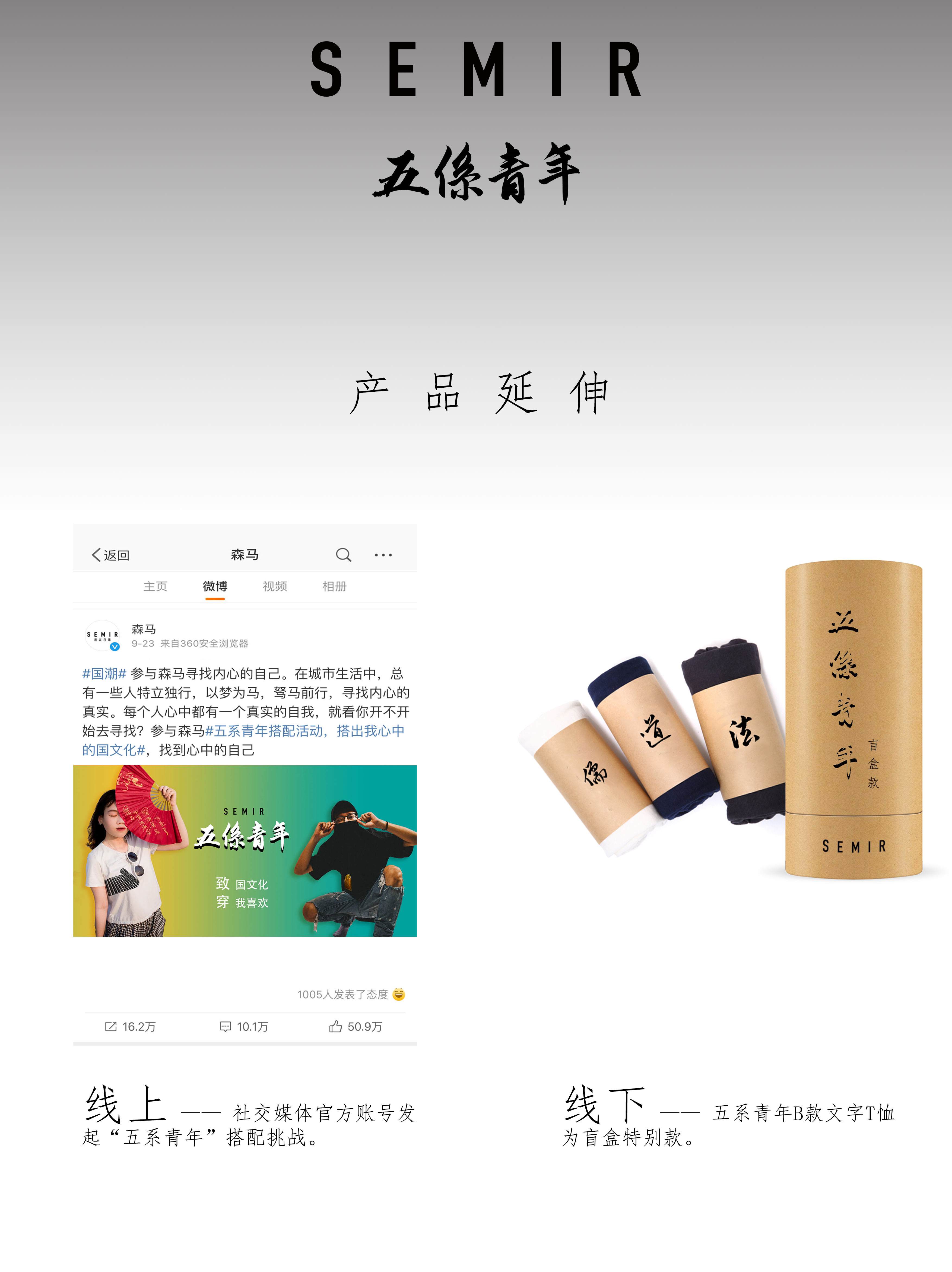 媒介延伸与营销策划。 线上发起“森马五系青年”话题和“五系青年穿搭挑战”活动,可与自媒体、时尚博主等合作,伴随评选、抽奖等方式,增加网络热议和话题度,既宣传森马的致敬国文化系列产品,又体现森马服装的好穿百搭特质,同时收获网友对“五系青年”的再创作,掀起跟风热潮。 线下将B款文字T恤制作为盲盒特别款,与正常商品一同投放至各网购平台和实体店面。消费者可选择正常购买A款五系青年T恤,也可选择在相同渠道购买更有乐趣性的盲盒T恤。考虑到纸袋的密封性低、方盒的便携性差,我们将盲盒包装设计成便携式桶形纸盒,方便购买者在商场等地购买后仍可轻松行动。