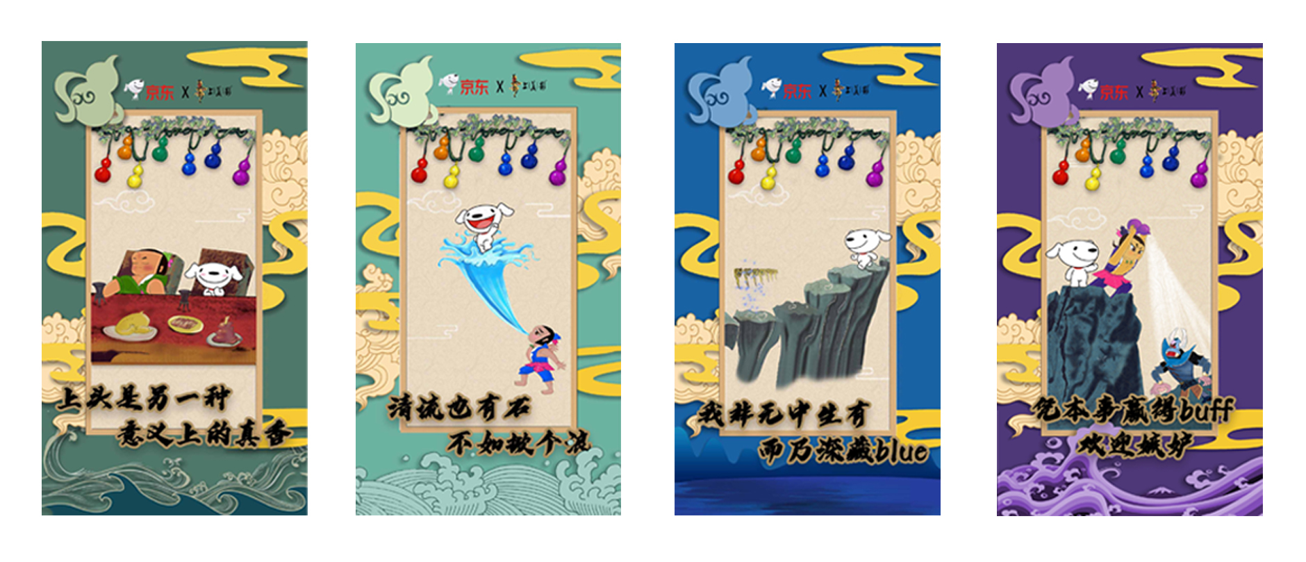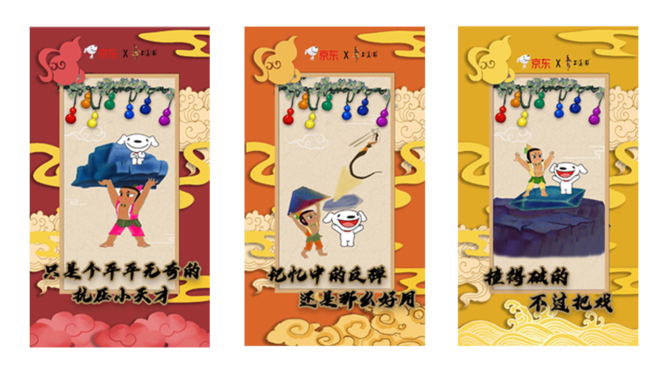 红娃:只是个平平无奇的抗压小天才。画面选用大娃抗山(山象征压力)的经典画面,joy乐于助人且阳光积极,会选择与大娃共同承担(象征京东陪伴客户共同抵抗生活压力)。 橙娃:记忆中的反弹,还是那么好用。画面中joy用反弹以牙还牙,救了二娃,还他心明眼亮。 黄娃:撞得破的,不过把戏。画面中三娃和joy共同打破妖精的魔镜,表达他们鼓励人们踏踏实实。