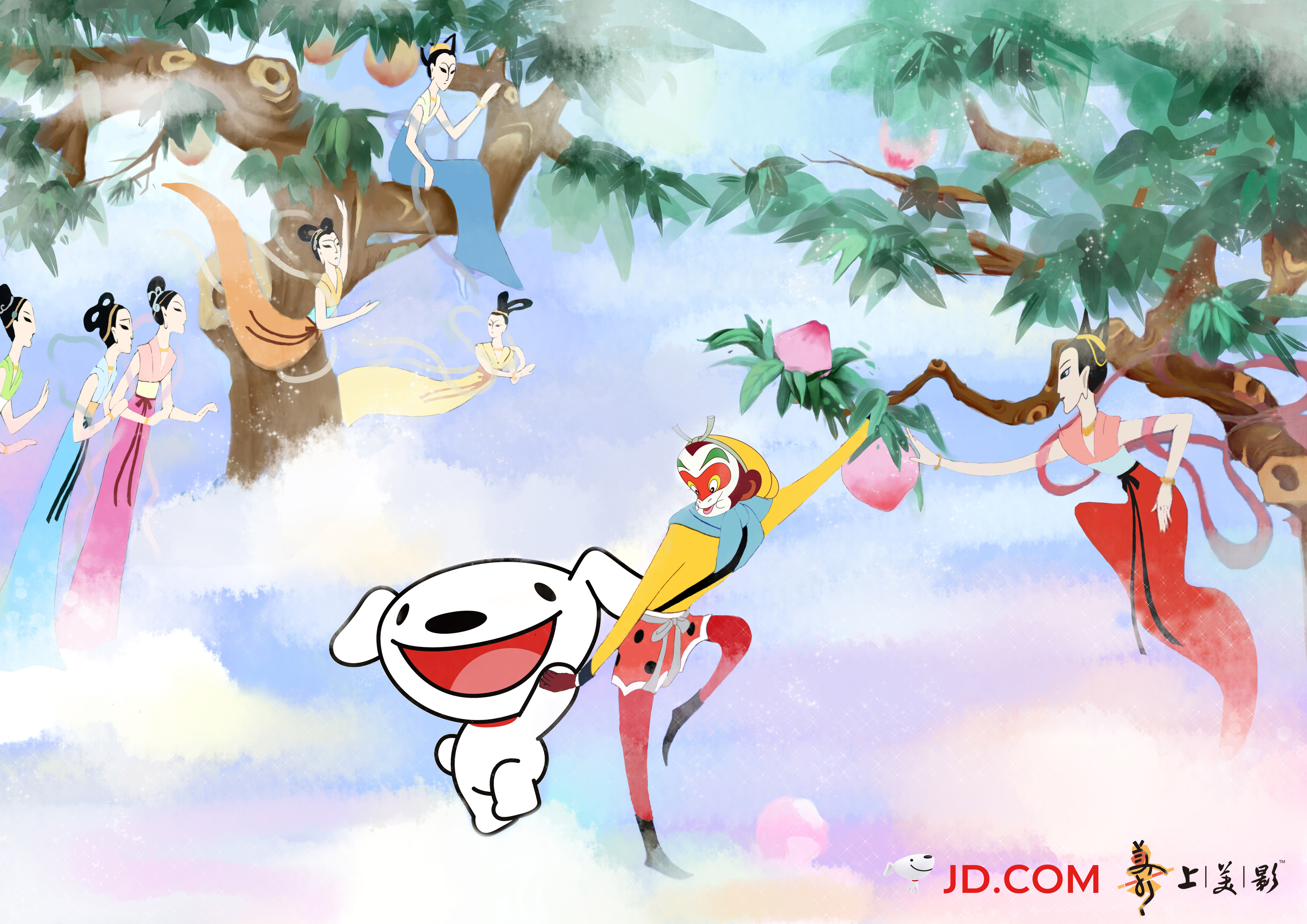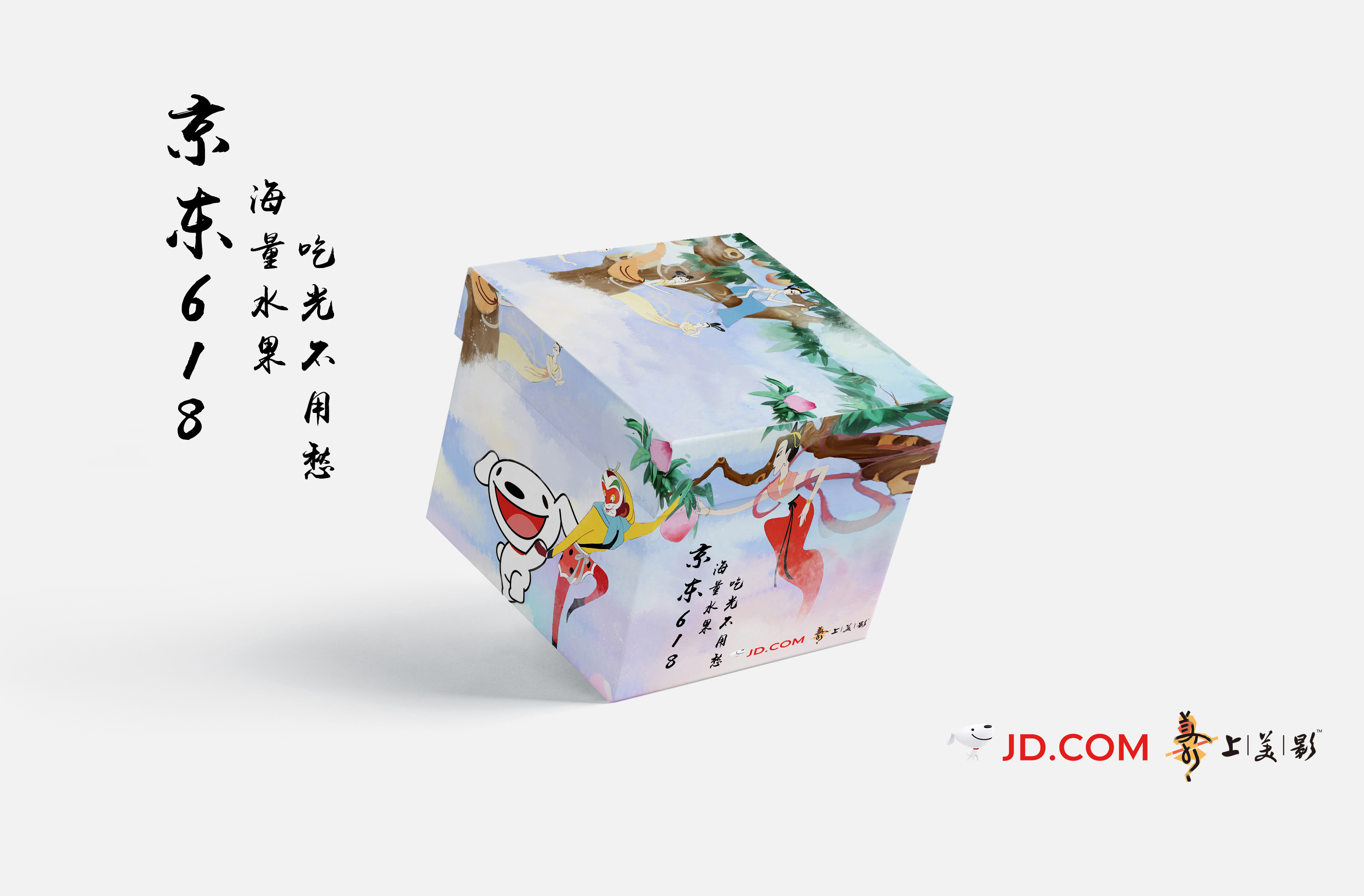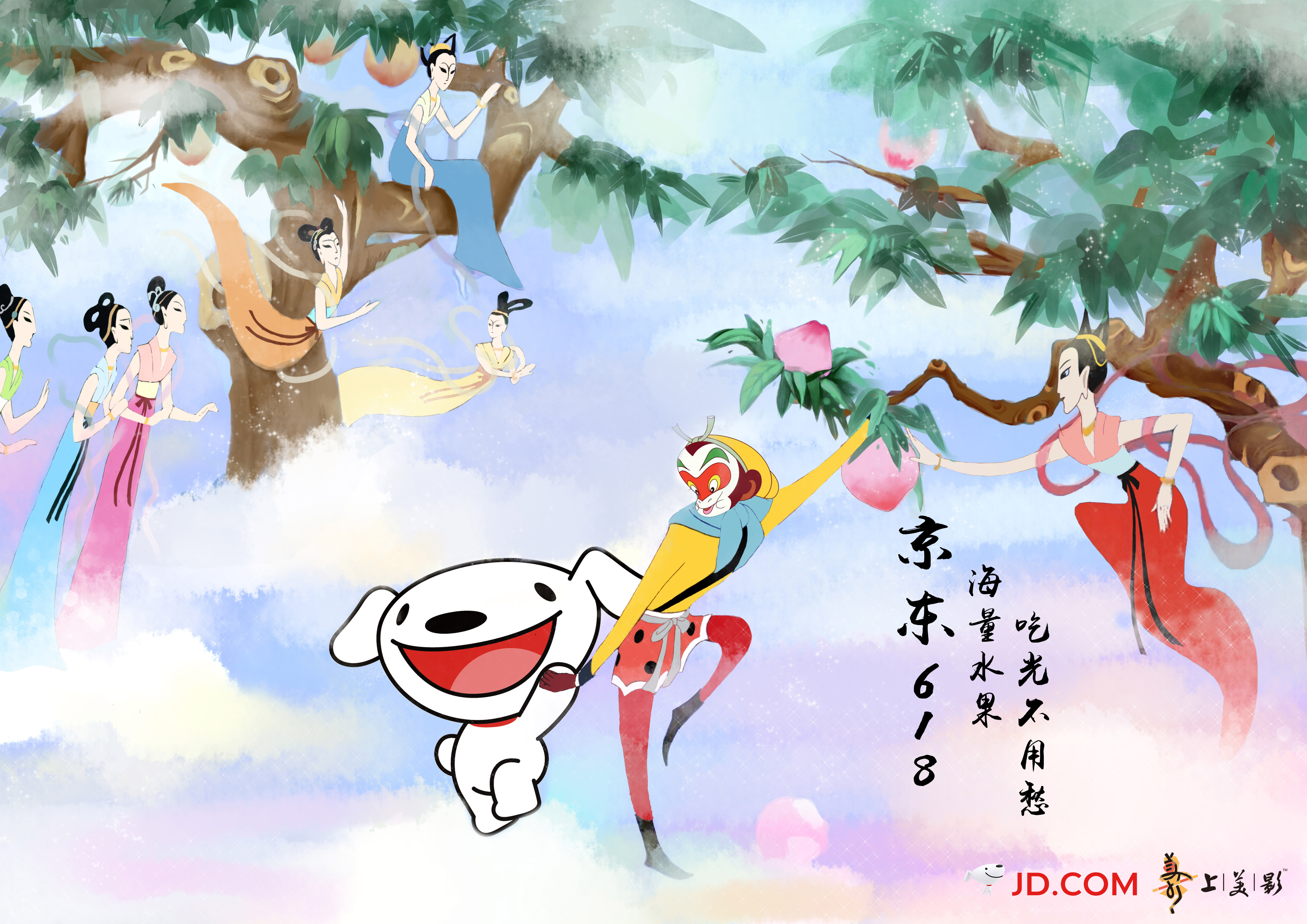 产品设计平面图:七仙女阻止大圣摘桃子 Joy:京东618,海量水果,吃光不用愁 在京东618水果一搜即有(大字)