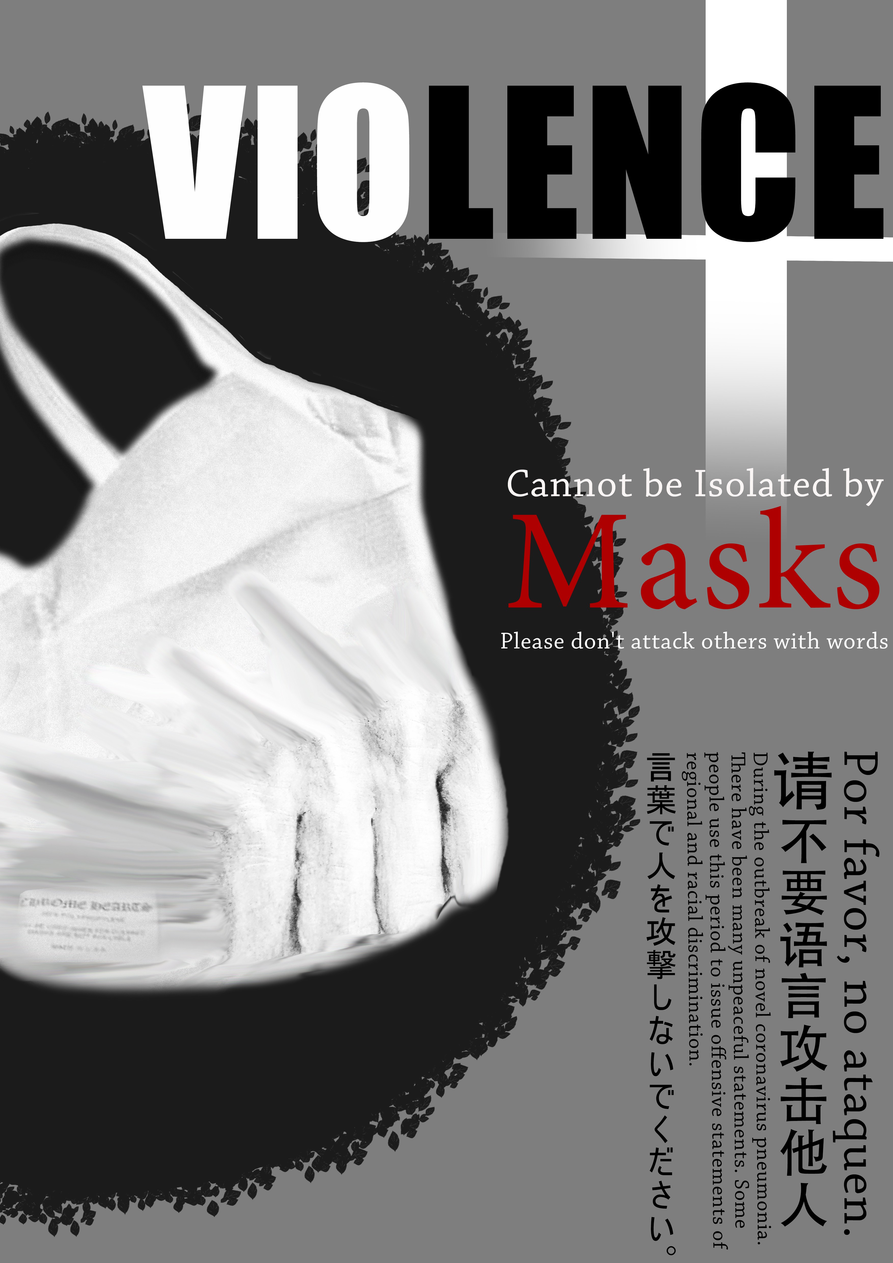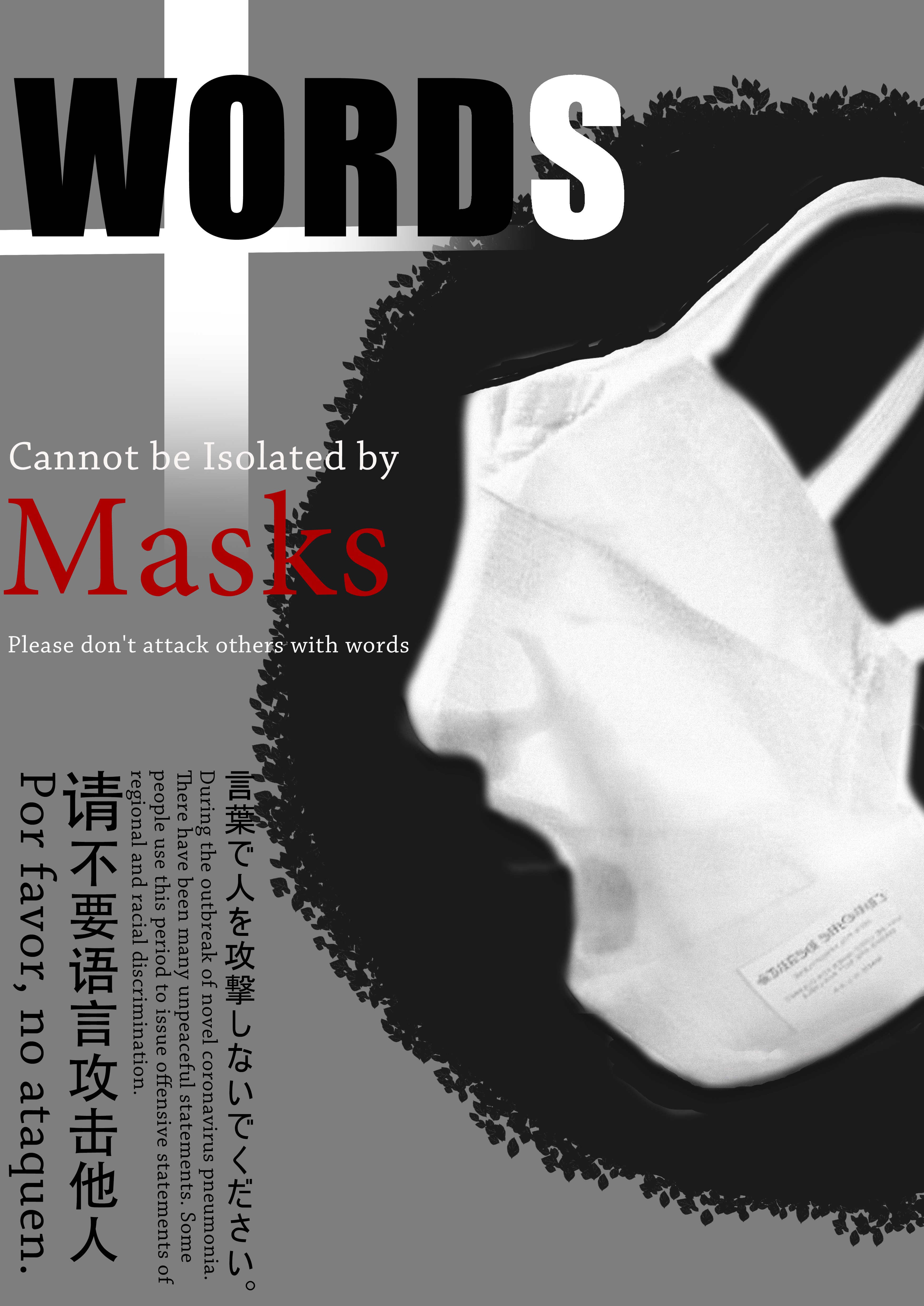 作品类别:平面广告 创意阐述:在作品中以一个突出口罩做喊叫辱骂状的人脸,以透过口罩也可以看得清楚的愤怒的人脸来传达恶意的言语是无法被口罩拦截的。There is a face with a prominent mask as a shouting and abusing face, and an angry face that can be seen clearly through the mask to convey malicious words can not be intercepted by the mask.