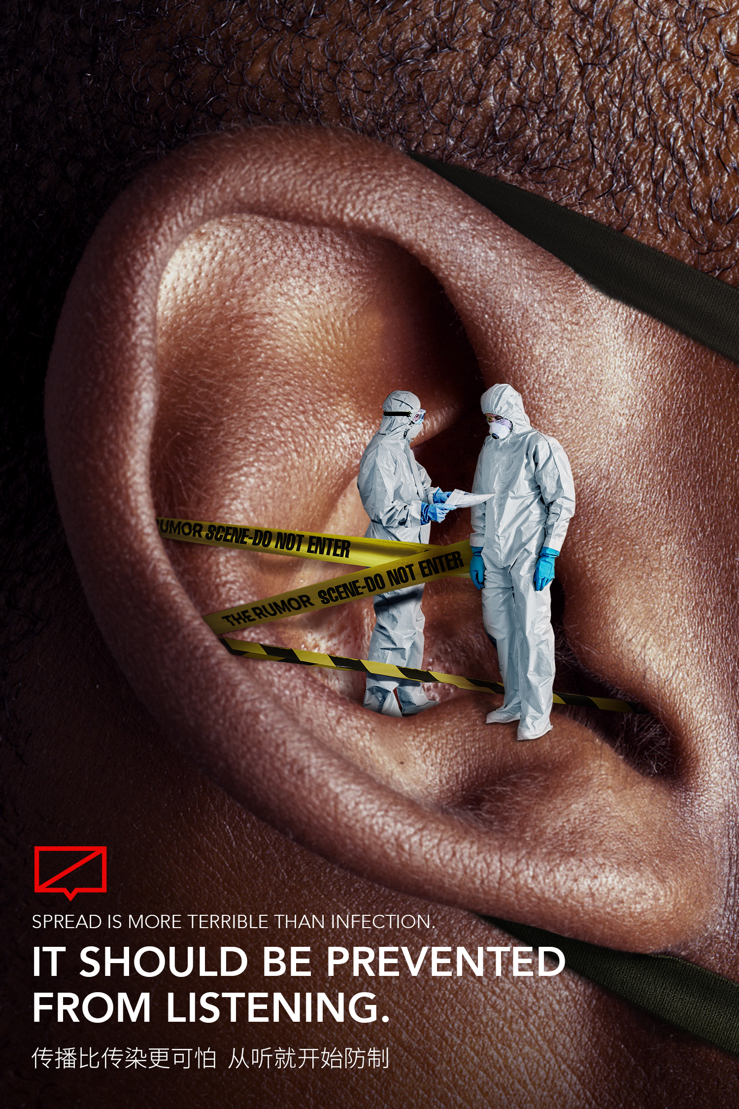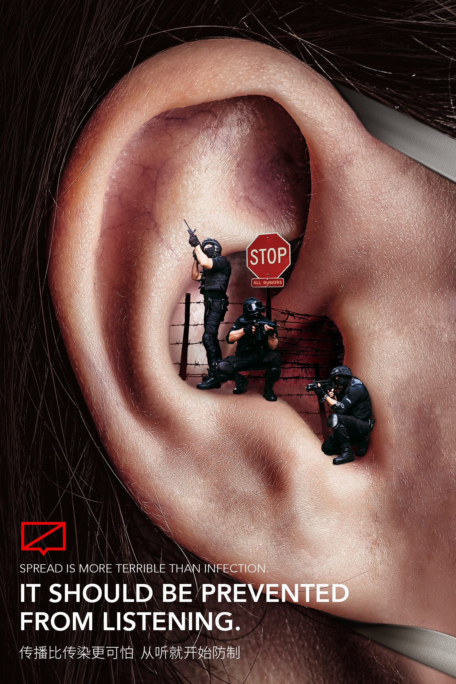 在耳朵入口设立防疫站,由防疫人员检测进入的信息是否是谣言。 Set up an epidemic prevention station at the entrance of the ear, and the epidemic prevention personnel would check if the information entering is a rumor.