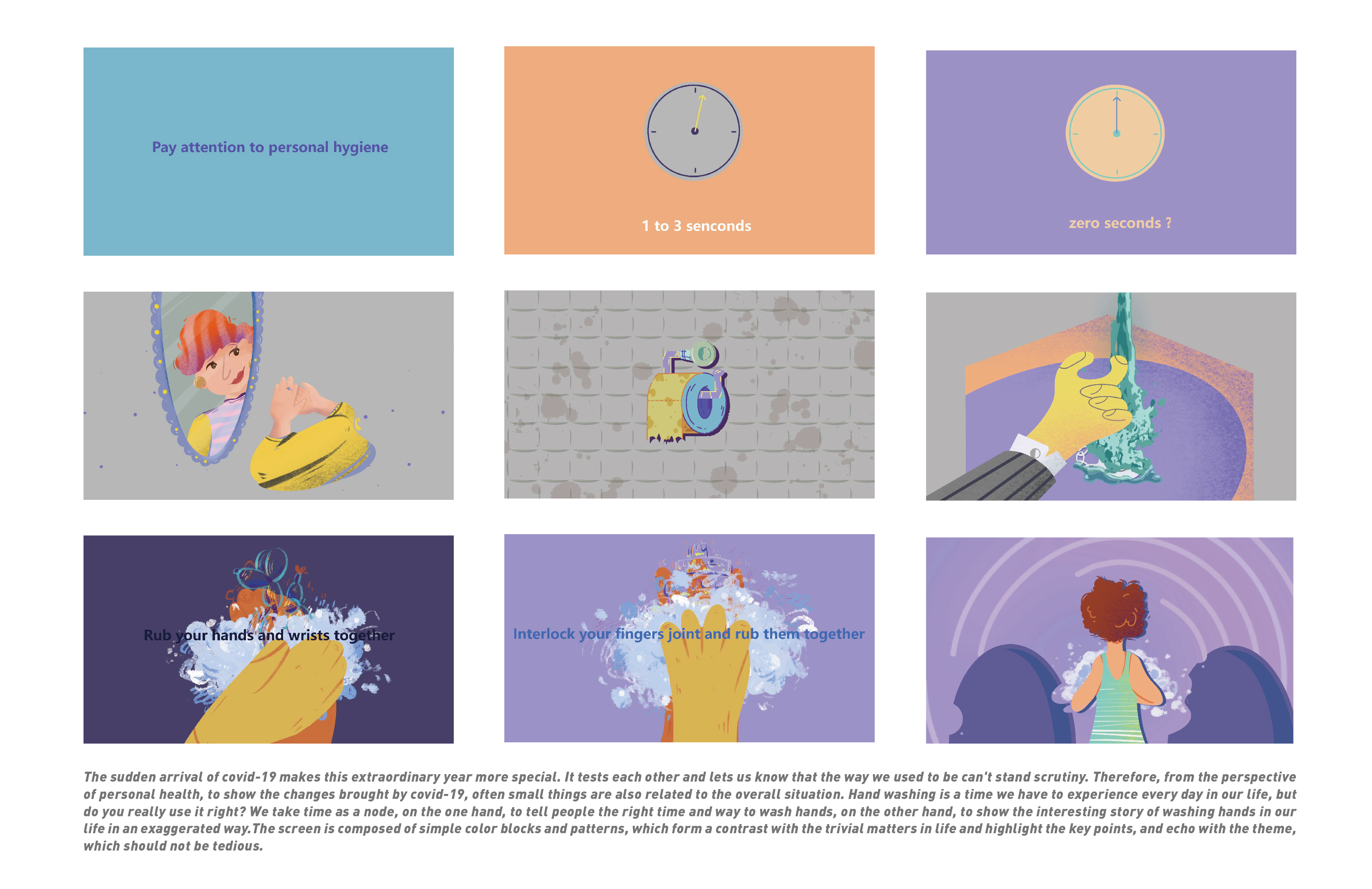 内容创新 Content Innovation 创意阐述 Creative elaboration:冠状病毒疾病的突如其来让这个本来就不凡的一年更加特殊。它考验着我们彼此,让我们知道原来习以为常的方式是那么经不起推敲。由此,从个人卫生的角度出发,来表现冠状病毒疾病带给我们的改变,往往小事儿也关系着大局。洗手是我们生活中天天要经历的时间,但是这个时间你真的用对了吗?我们以时间为节点,一方面来告诉人们正确的洗手时间和方式,另一方面以夸张的方式来展现我们生活中洗手时间的有趣故事。画面由简单色块和图案组成,与生活中琐事形成对比突出重点,又与主题这个本该不繁琐的方式呼应起来。 The sudden arrival of covid-19 makes this extraordinary year more special. It tests each other and lets us know that the way we used to be can't stand scrutiny. Therefore, from the perspective of personal health, to show the changes brought by covid-19, often small things are also related to the overall situation. Hand washing is a time we have to experience every day in our life, but do you really use it right? We take time as a node, on the one hand, to tell people the right time and way to wash hands, on the other hand, to show the interesting story of washing hands in our life in an exaggerated way.The screen is composed of simple color blocks and patterns, which form a contrast with the trivial matters in life and highlight the key points, and echo with the theme, which should not be tedious.