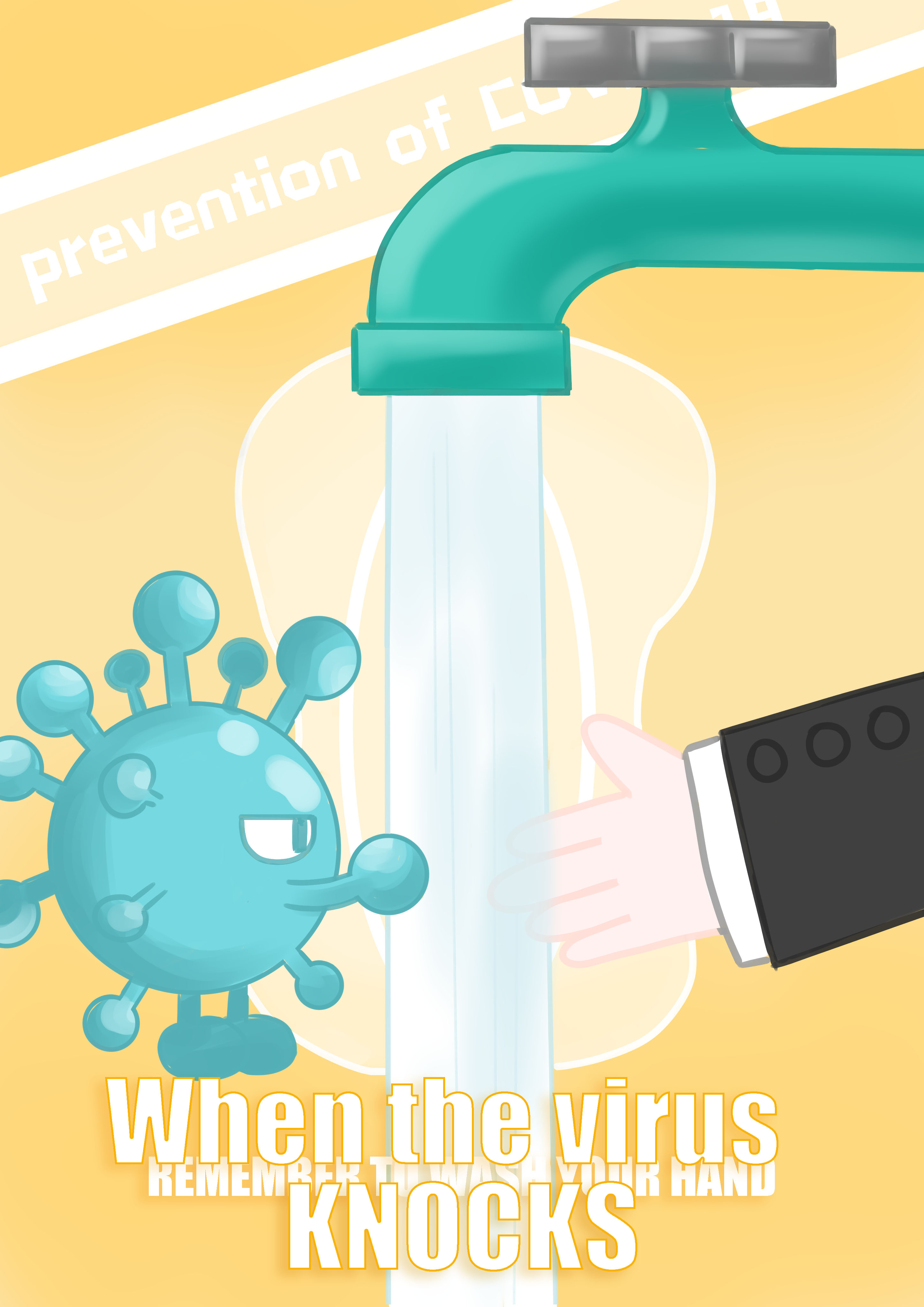 广告创新类-平面作品 以水龙头的水流作为与病毒的一道‘门’,背景是一块肥皂,目的是告诉人们,在日常生活中正确洗手,使用肥皂洗手是有效防止新冠疫情发生的措施,每天勤洗手,正确洗手,才能够有效和病毒阻隔。