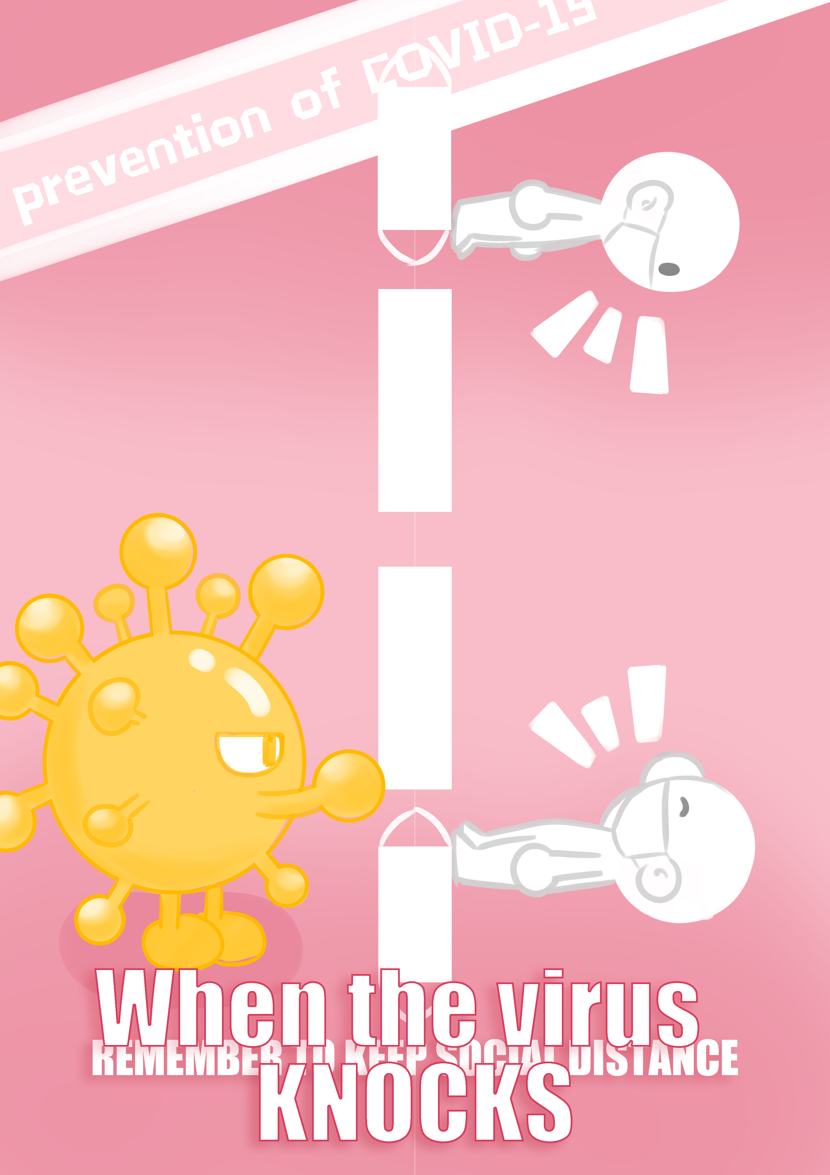 广告创新类-平面作品 以口罩作为阻隔,左边为敲门的病毒,右边为戴上口罩的一家人。不论大人还是小孩,每个人都需要在生活中戴上口罩,才能构建起和病毒相隔的“门”,让病毒无法轻而易举的进入我们的生活,进入到人体当中。
