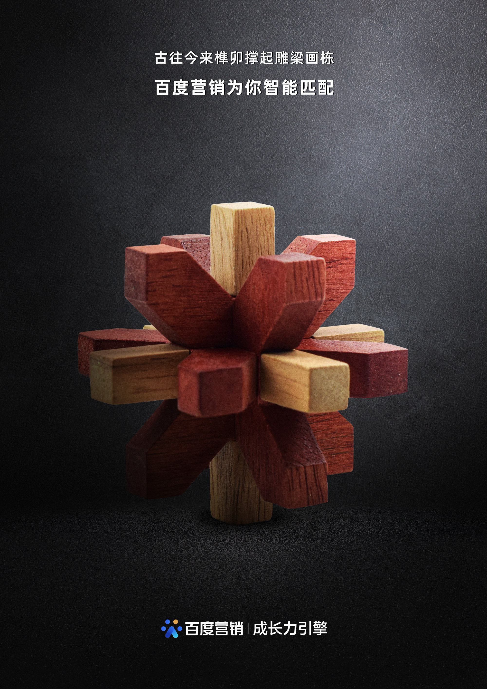 匹配用户和客户的完美契合(榫卯结构) 以古代发明“榫卯结构”作为类比来呈现海报画面,通过古代人为了房屋结构或木质用品的牢固程度而发明出的“榫卯结构”,达到无需钉子就可以无缝契合的效果,来体现——匹配用户和客户就好比榫卯结构,能够完美契合,想表达之意也就是“百度营销绝对的精准”。