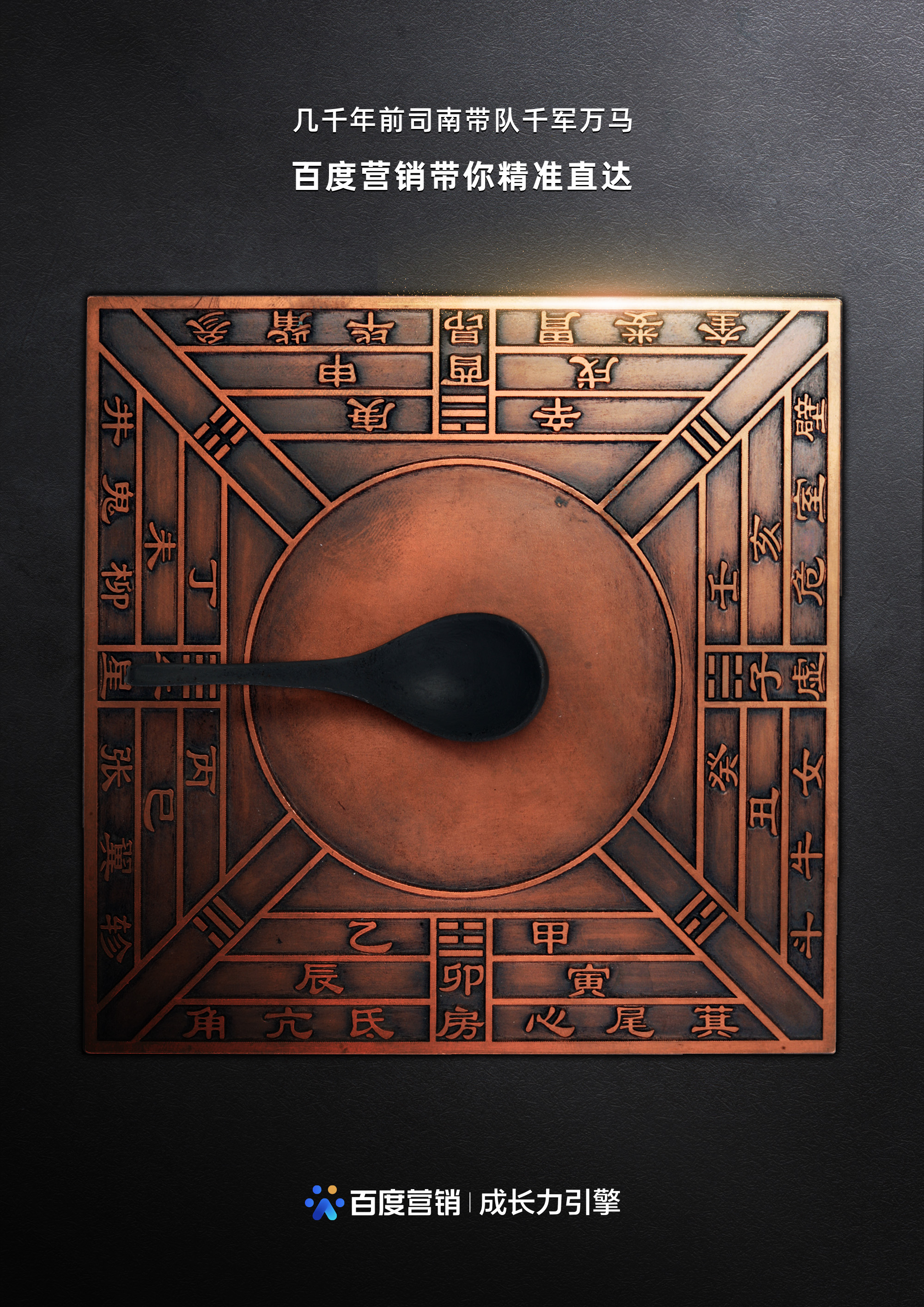 百度营销能导航(司南) 以古代发明“司南”作为类比来呈现海报画面,想通过用司南在古代的运用之处来体现百度营销在当下的作用——能够为广告主更好的指引投放方向。