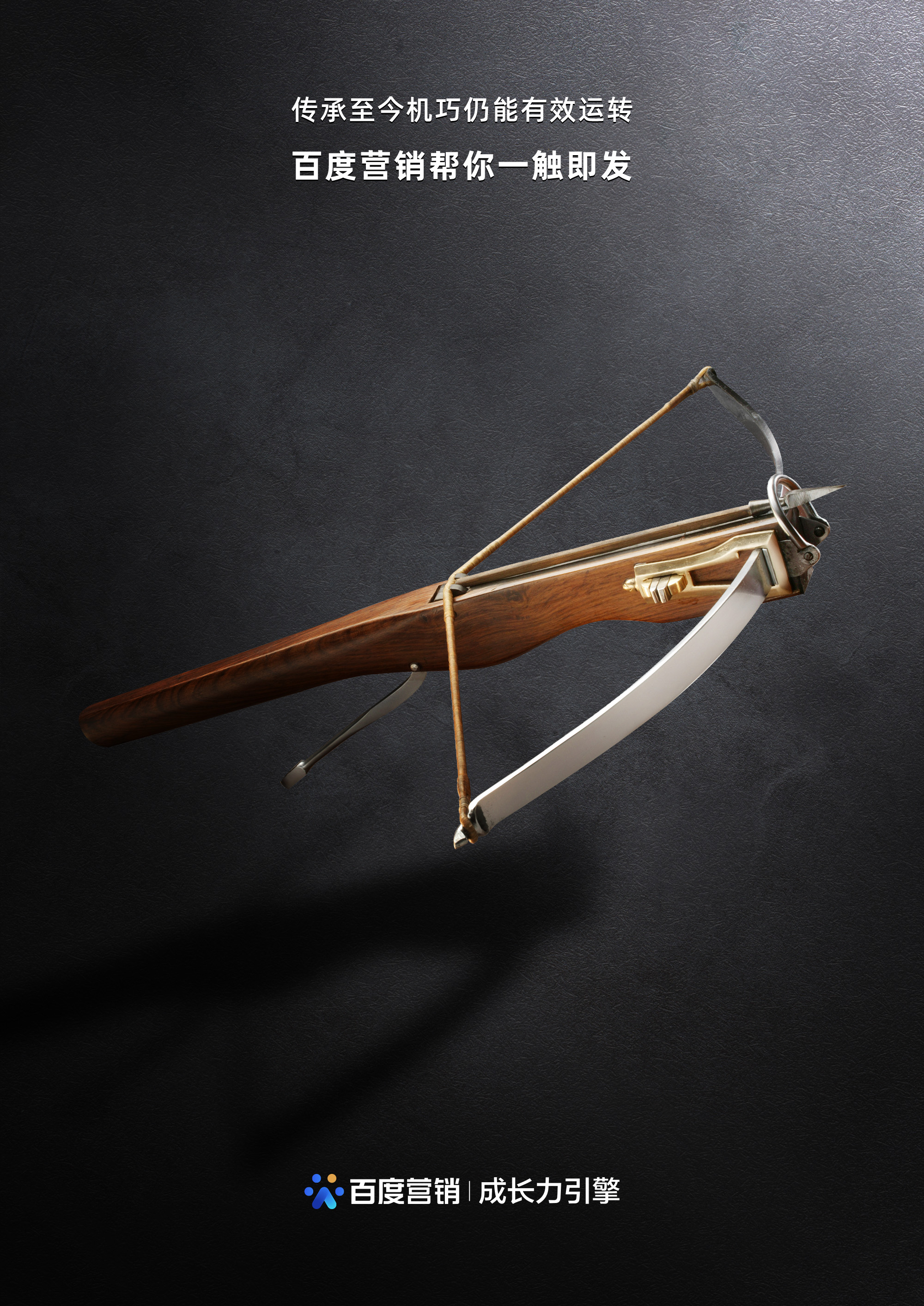 便捷可靠,时刻准备投放(弩箭) 以古代发明“弩箭”作为类比来呈现海报画面,通过古代人为了能够在战场中更加快而准的击败敌人而发明出的“弩箭”,来体现——客户能够快速便捷而又精准的向需求人群投放出自己的内容。