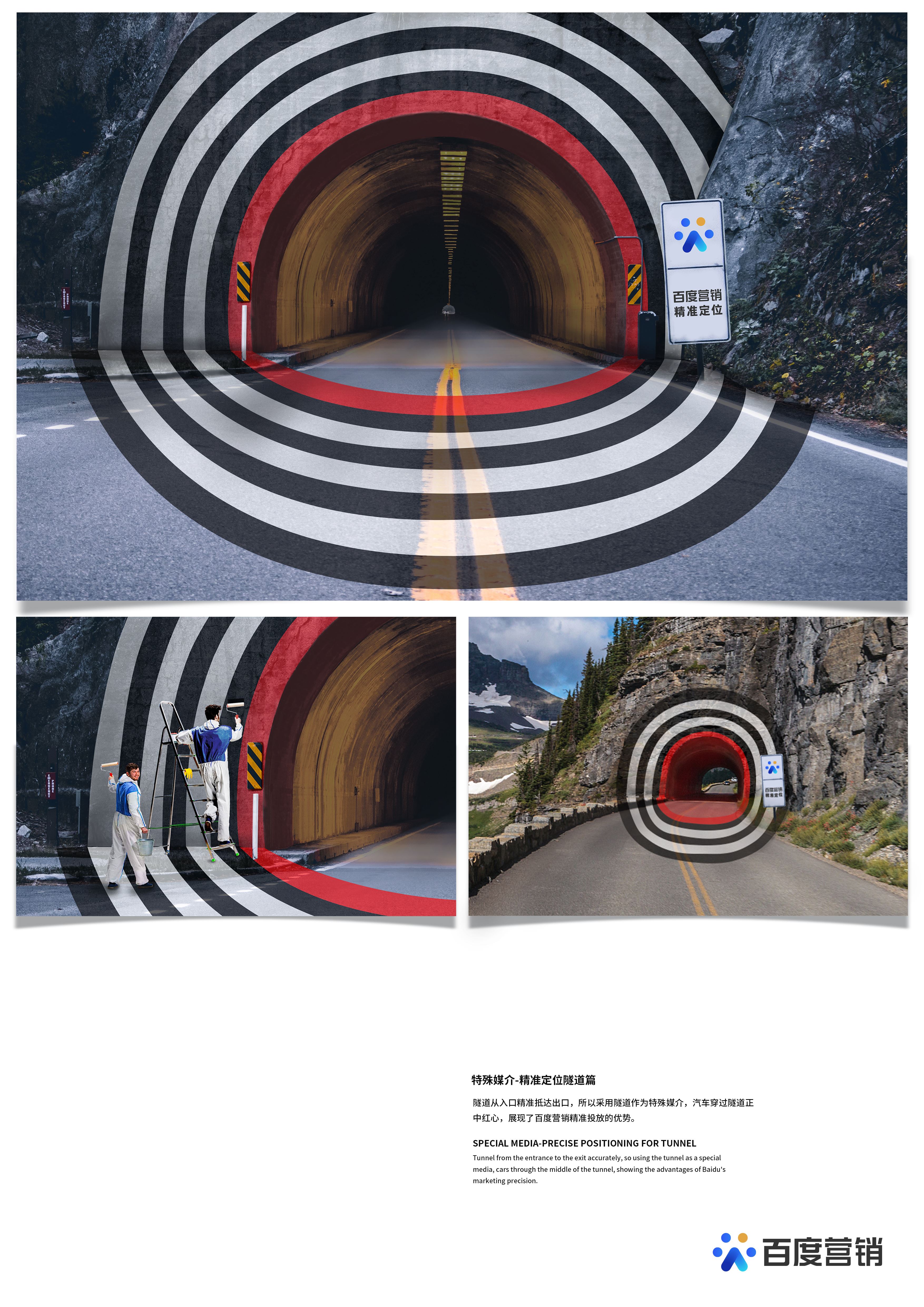 隧道从入口精准抵达出口,所以采用隧道作为特殊媒介,汽车穿过隧道正中红心,展现了百度营销精准投放的优势。