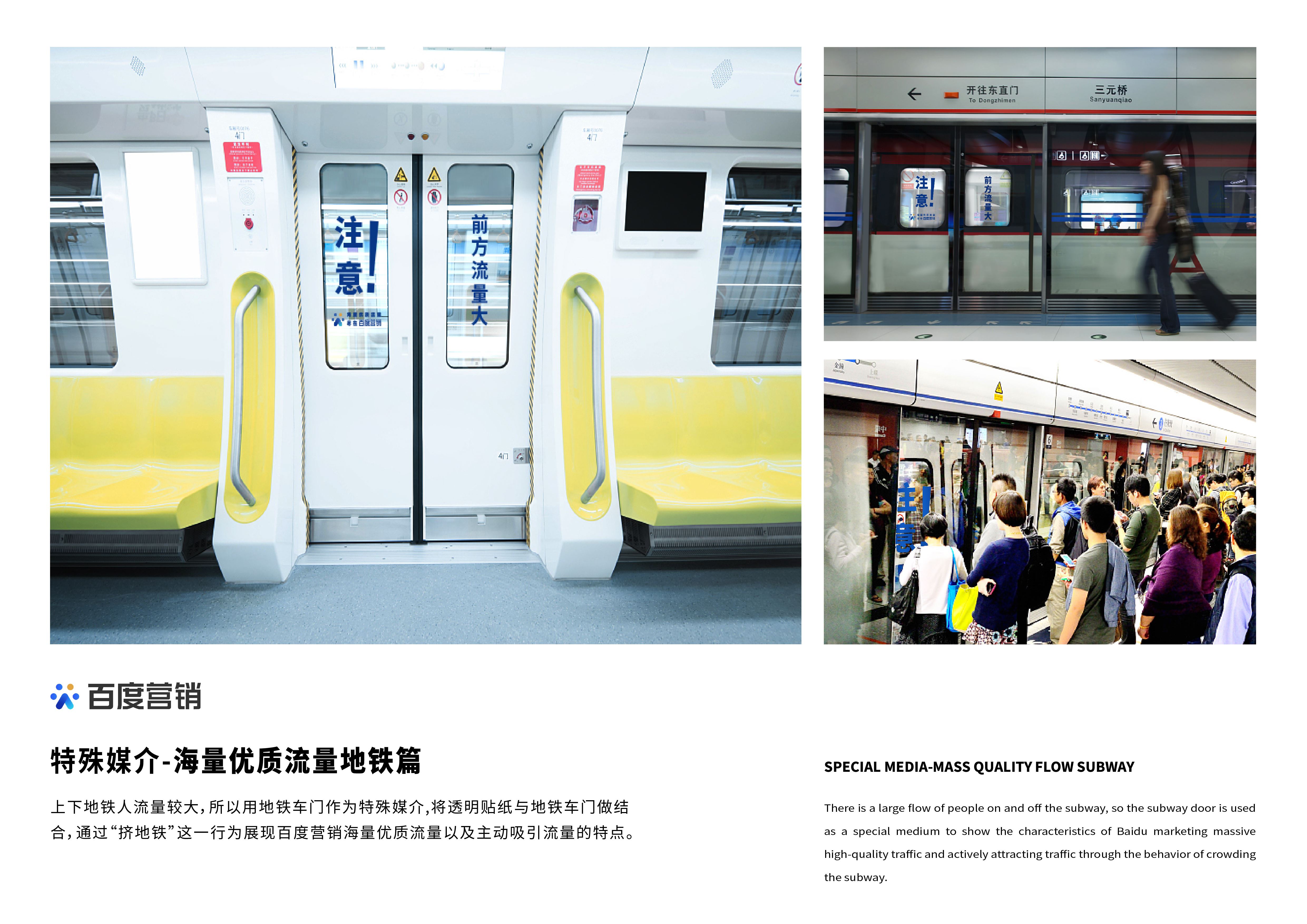特殊媒介-海量优质流量地铁篇 5 215 0 特殊媒介 分享 上下地铁人流量较大,所以用地铁车门作为特殊媒介,将透明贴纸与地铁车门做结合,通过“挤地铁”这一行为展现百度营销海量优质流量以及主动吸引流量的特点。 赞一下 乘风破浪第二分队 ‹ › 发布