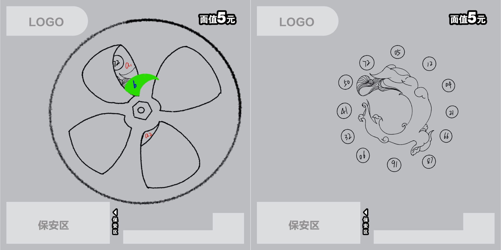 这张彩票分为两层,左图是上层,是一个水龙头的形状,b区域可以撕开透出下层的图案。右图是下面那层,有缓缓消失的水波纹和号码。消费者手指卡进a1、a2区域可以旋转水龙头,彩票号码会逐一呈现,水波也会逐渐变小。将开彩票的方式模拟成关水龙头,寓意节约用水。