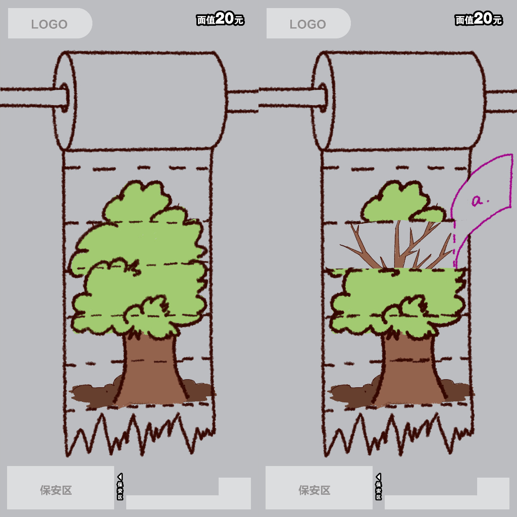 这张彩票分为两层。上层是一张画着生机勃勃大树的卫生纸,a示例区域可以撕开,次开猴展现出下层枯萎的老树。将开彩票的方式模拟成撕纸巾,寓意节约用纸。