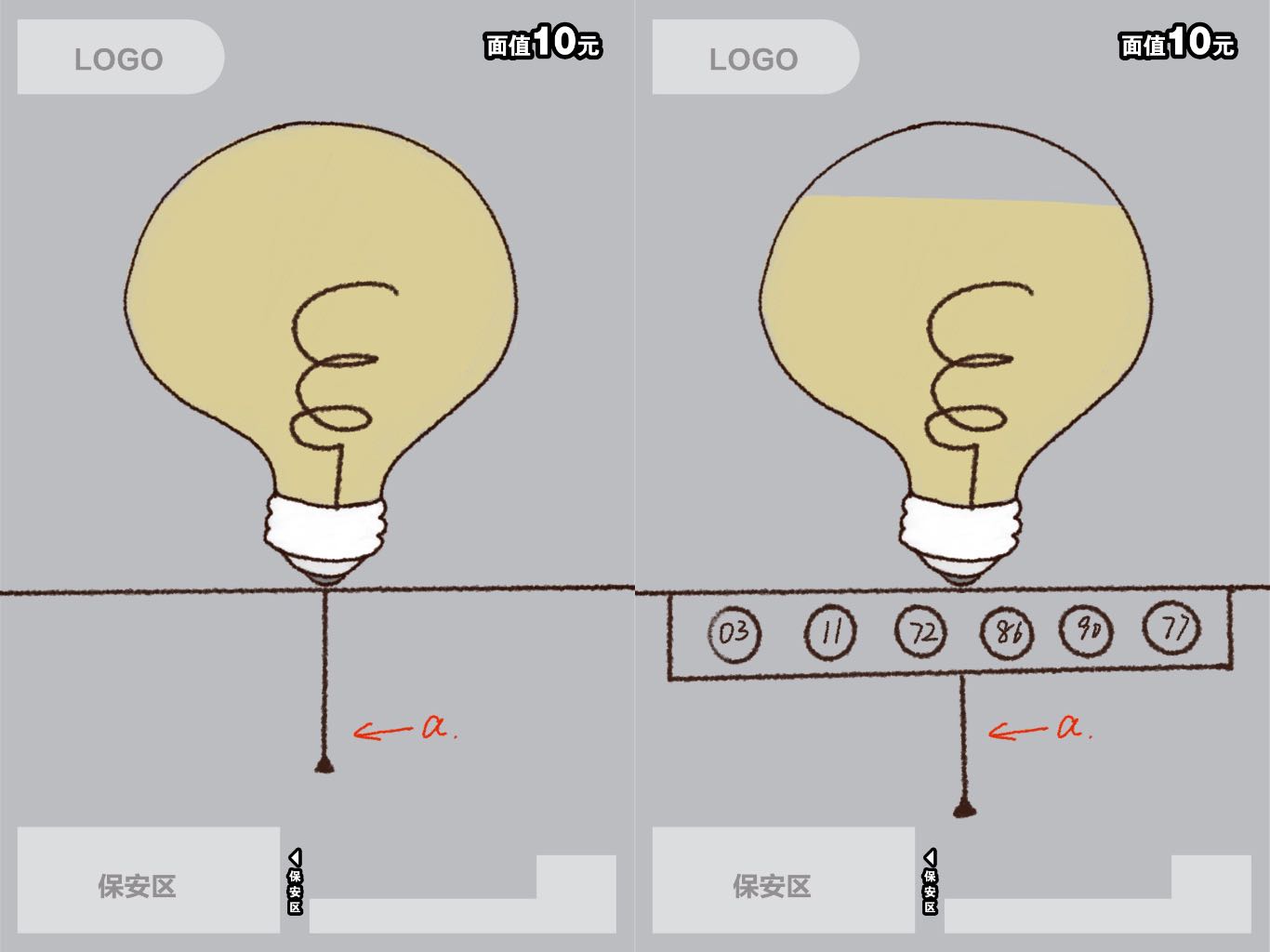 这张彩票以中间的线条为开口,分为两层,左图是开奖前,右图是开奖过程。a是一条真实的绳子,通过拉拽,在绳子上的号码卡片会逐排展现,上方的灯泡的颜色也逐渐消失。将开彩票的方式模拟成关灯,寓意节约用电。