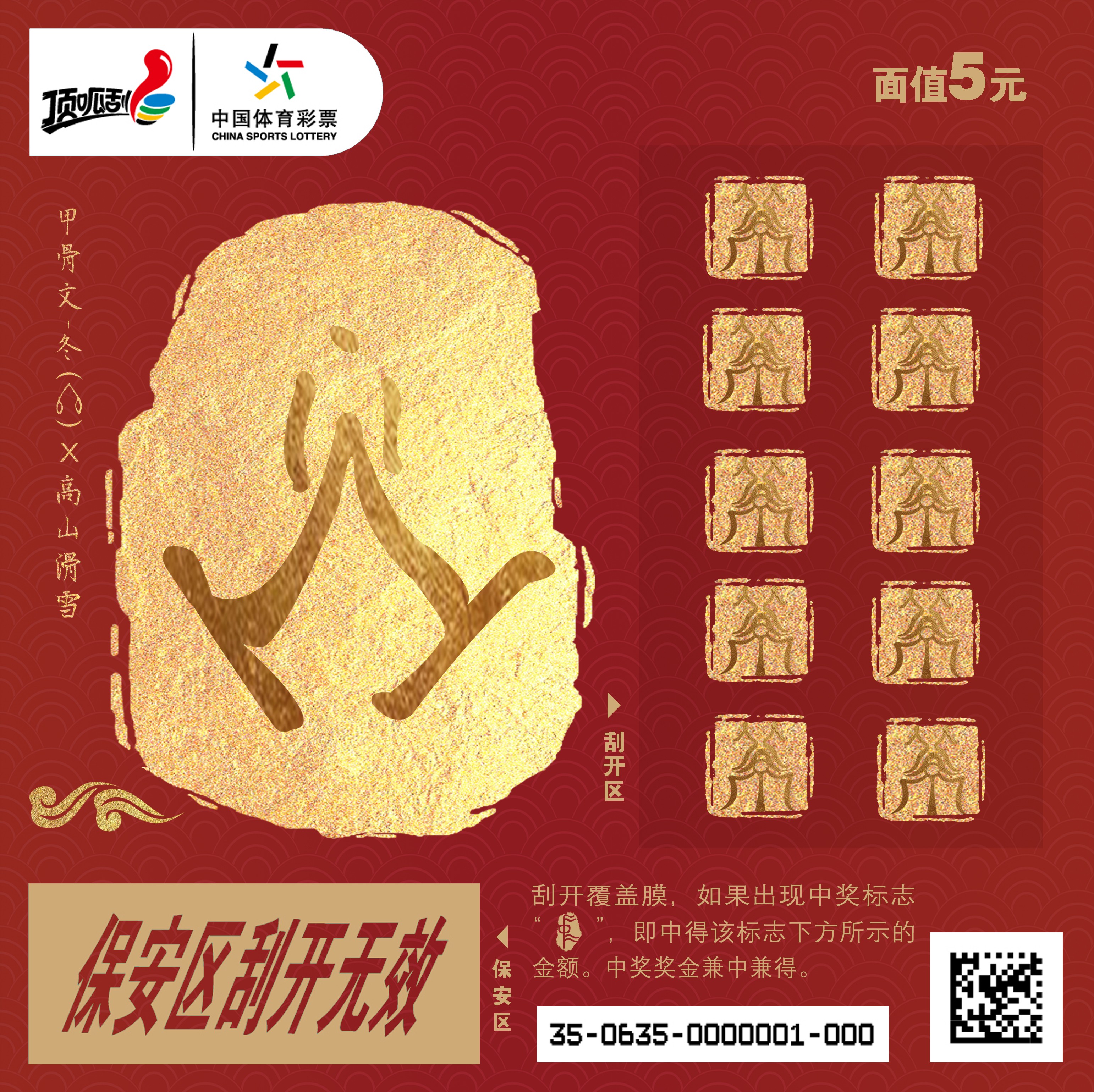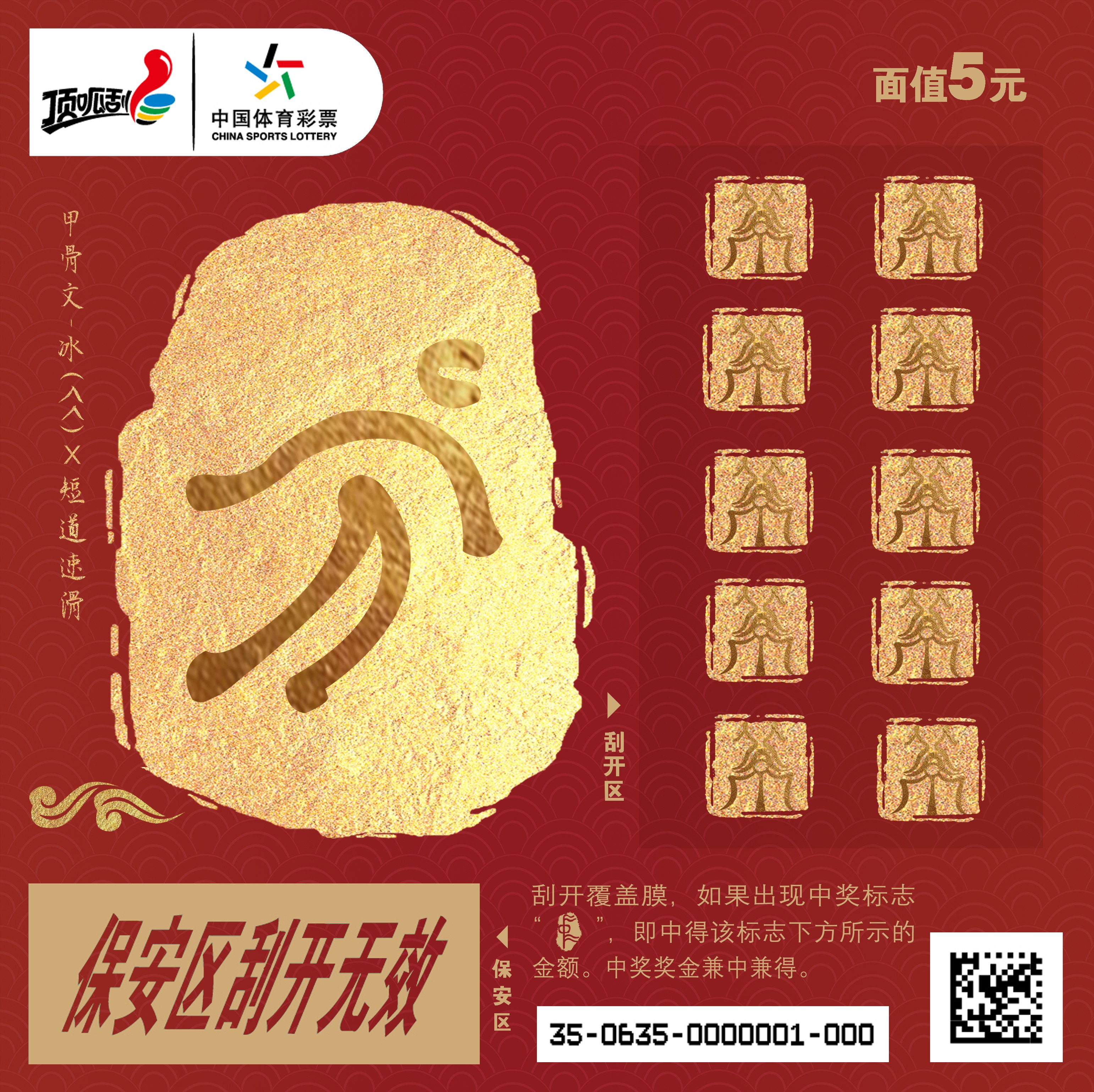 五元系列彩票设计: 甲骨文中的“冰”的整个字形与短道速滑的运动员的形态相结合,通过彩票画面,消费者在了解中国古老文化的同时,还能领略冰雪运动的风光。并且在古代,所有的奖赏都是以盖章的形式确认颁发,因此将印章图案作为我们的表达形式,代表好运,与彩票的整体基调相呼应。 另外,北京作为冬奥会的主办城市,也是世界上唯一举办了夏季奥运会和冬季奥运会的城市,我们将“北京”的甲骨文上下排列,制作成刮奖区的图案。而刮开之后的中奖图案,我们选用了“中(zhòng)”的甲骨文,“中”在古代也有“中举“等寓意,象征着好彩头。