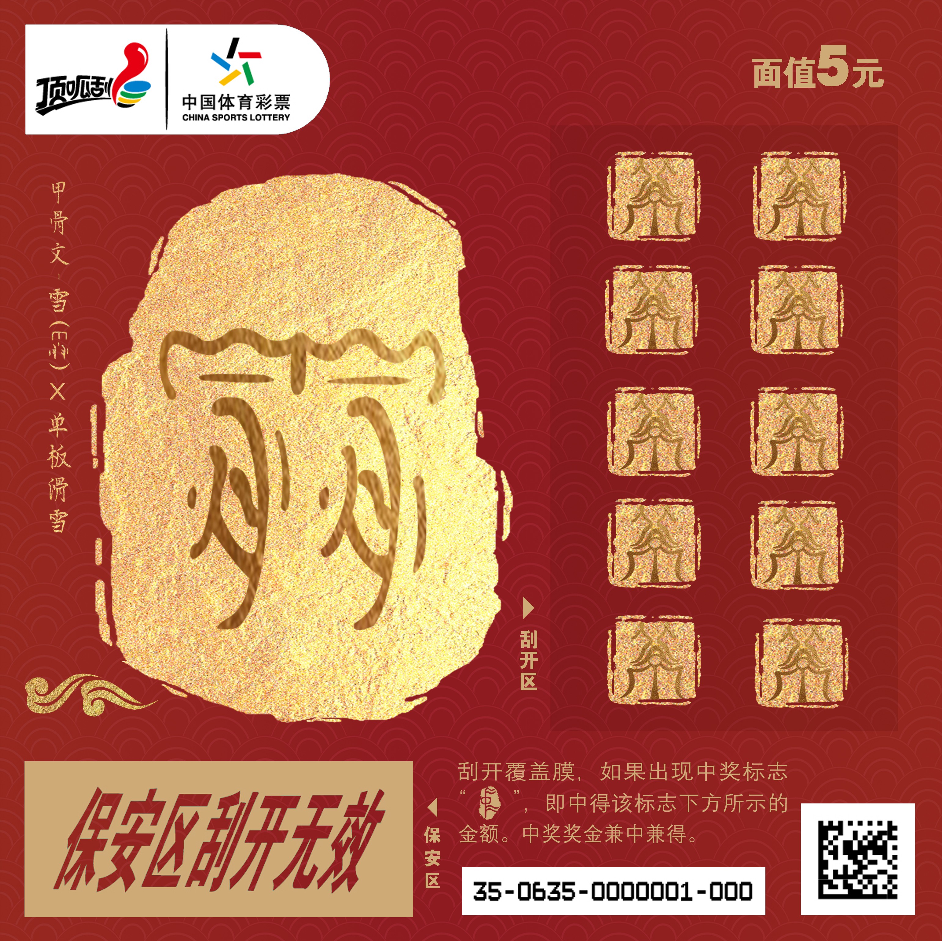 五元系列彩票设计: 甲骨文中的“雪”,我们将下半部分与单板滑雪的形态进行融合,展现滑雪的动态,使古老的文字重新具有活力。并且在古代,所有的奖赏都是以盖章的形式确认颁发,因此将印章图案作为我们的表达形式,代表好运,与彩票的整体基调相呼应。 另外,北京作为冬奥会的主办城市,也是世界上唯一举办了夏季奥运会和冬季奥运会的城市,我们将“北京”的甲骨文上下排列,制作成刮奖区的图案。而刮开之后的中奖图案,我们选用了“中(zhòng)”的甲骨文,“中”在古代也有“中举“等寓意,象征着好彩头。