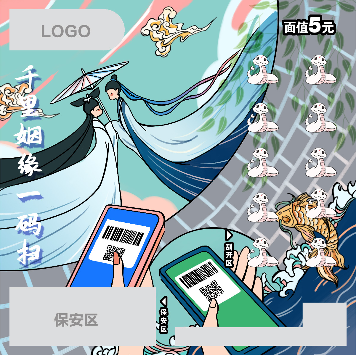 中国体育彩票面值5元平面设计,白蛇传的故事流传千古,断桥相会的爱情从一次借伞开始,浪漫而飘忽,蒙上神秘的面纱。我们设想,如果白娘子与许仙来到现代,利用扫码交友,这段爱情应该会更加坦诚热情,移动支付给现代社会带来便捷的同时,又给予我们每个人更加丰富的社交生活,人与人之间更加情感有了更加多元的载体,人情引领全社会走向更美好的未来。