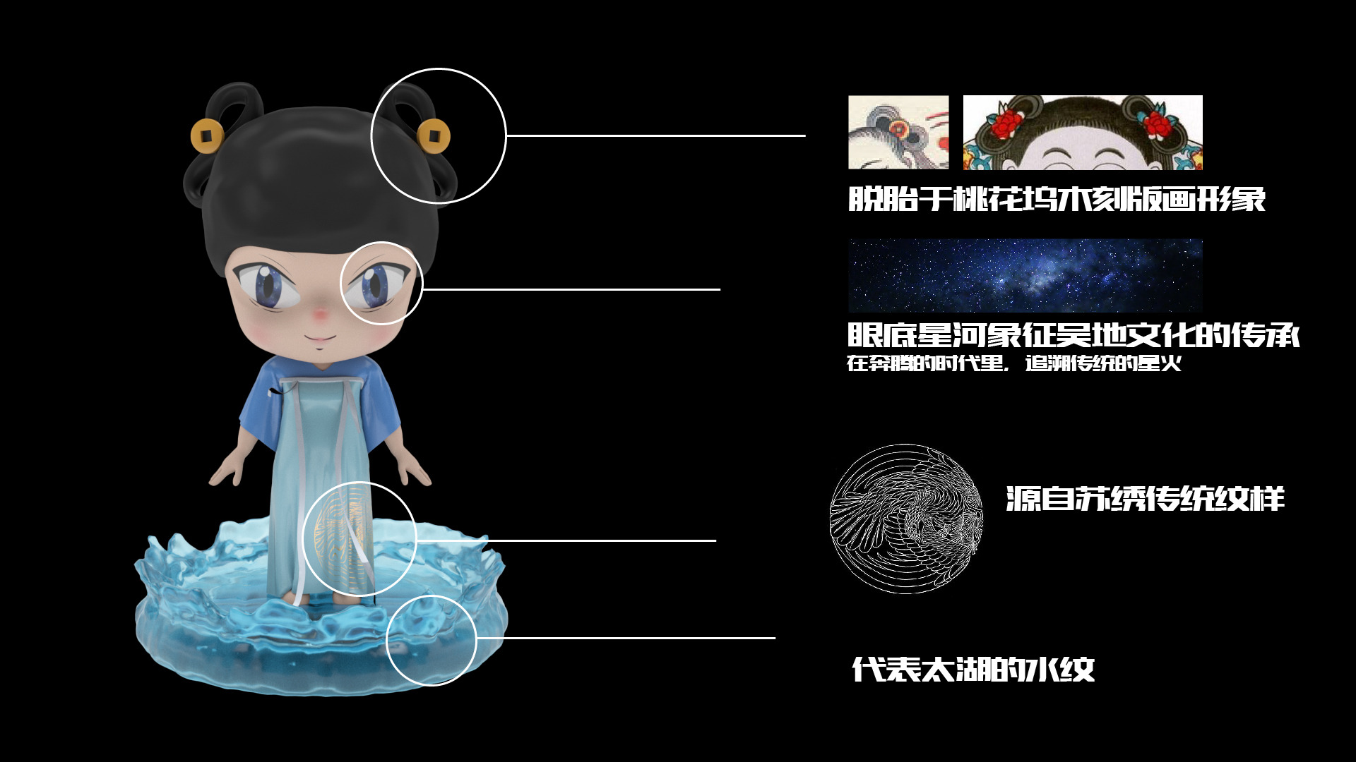 4. 灵感来源: - 发型:脱胎于苏作非遗“桃花坞木刻版画”中家喻户晓的小女孩形象 - 眼睛:眼底星河象征吴地文化的传承 - 服饰:源自非遗“苏绣”的传统纹样 - 底座:代表太湖旅游文化概念的水纹