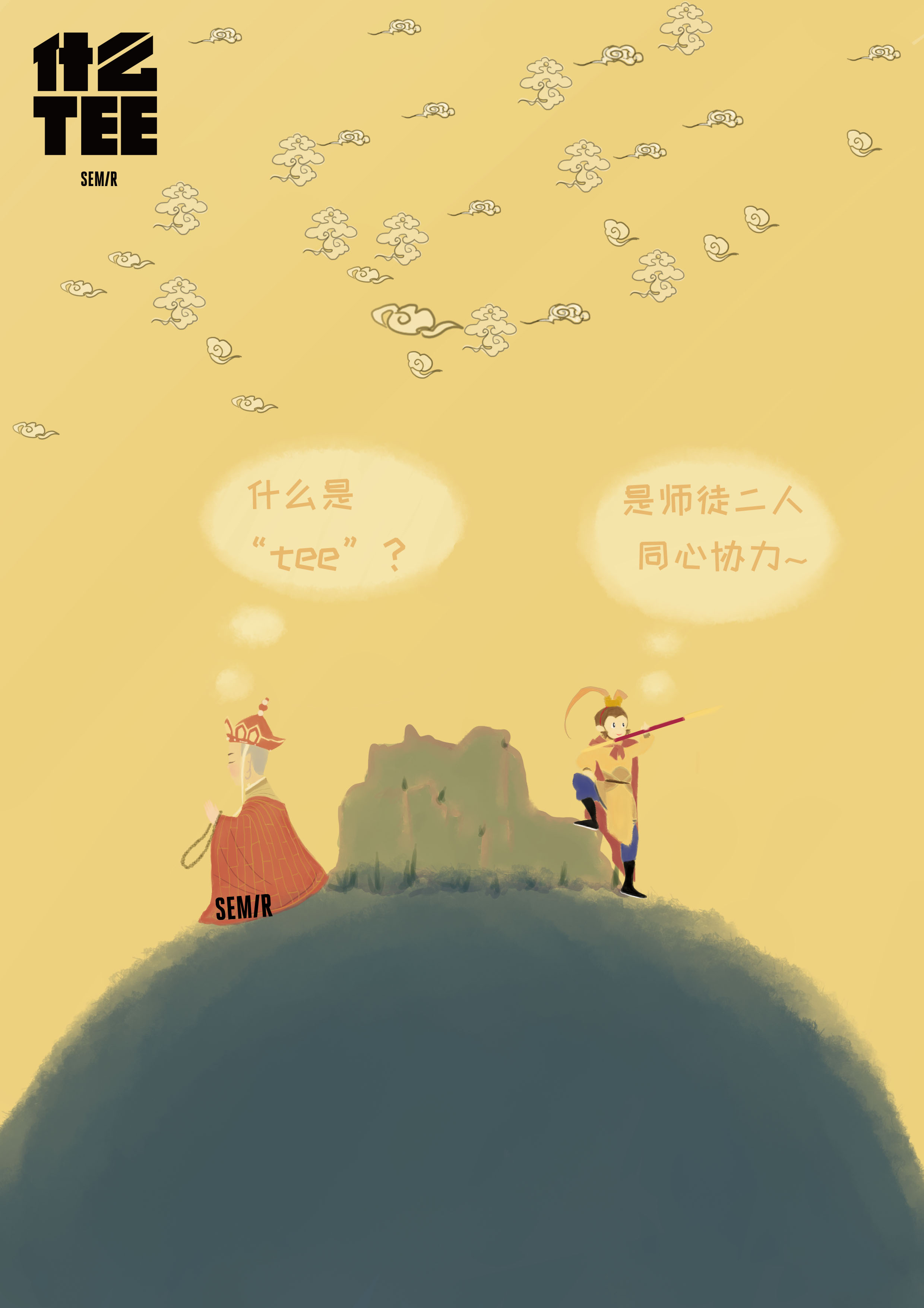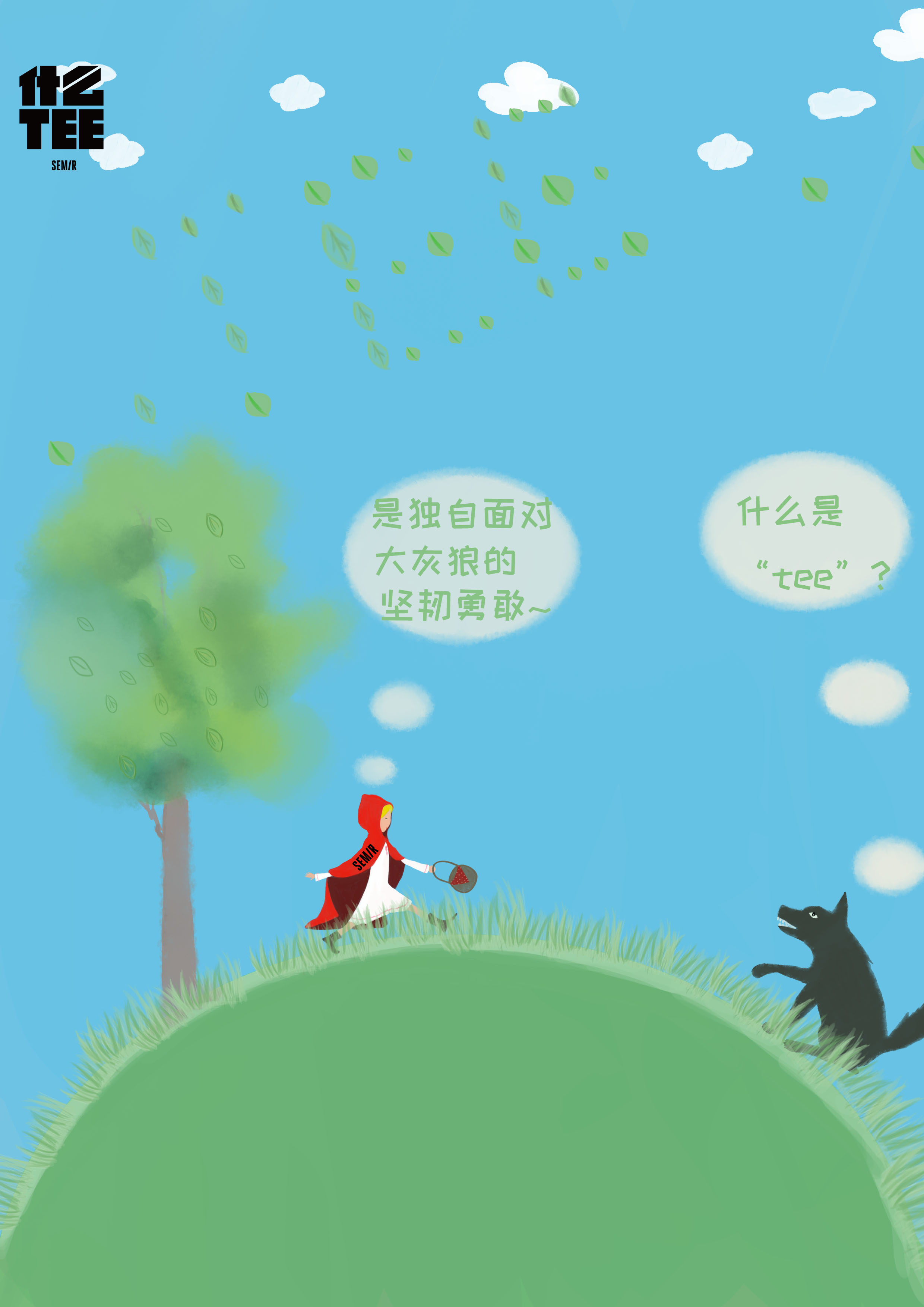 是大众耳熟能详的童话故事。小红帽给外婆送东西去森林遇见大灰狼。这幅作品采用截取小红帽遇见大灰狼的一幕,又融入了品牌元素。天上的随风飘的树叶成”tee“形,大灰狼问小红帽什么是tee。小红帽回答是她的坚毅勇敢。 小红帽很像当下的年轻人,为了母的愿意去未知的地方面对未知的风险。这就是勇敢,也是当下年轻人的写照。